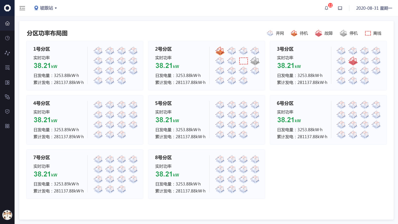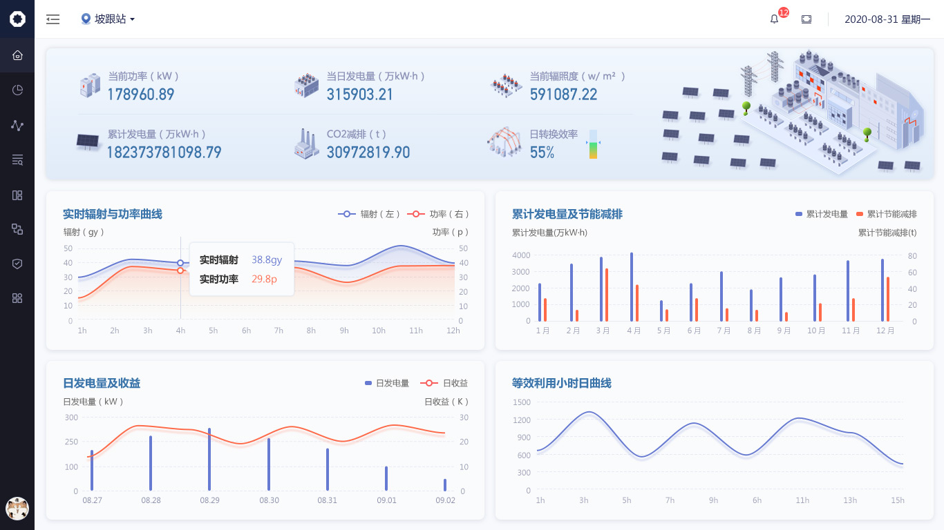 針對數(shù)據(jù)信息發(fā)生的變化,我們使用“場景化設計原則“,用立體圖標方式繪制出從”光伏板-逆變器-交流匯流箱“發(fā)電原理圖,把數(shù)據(jù)展示在對應的環(huán)節(jié)中,形成可視化的實時監(jiān)控圖譜。;其余與發(fā)電流程無關(guān)的數(shù)據(jù)也均以圖標+文字的形式展示頁頁面右側(cè)。