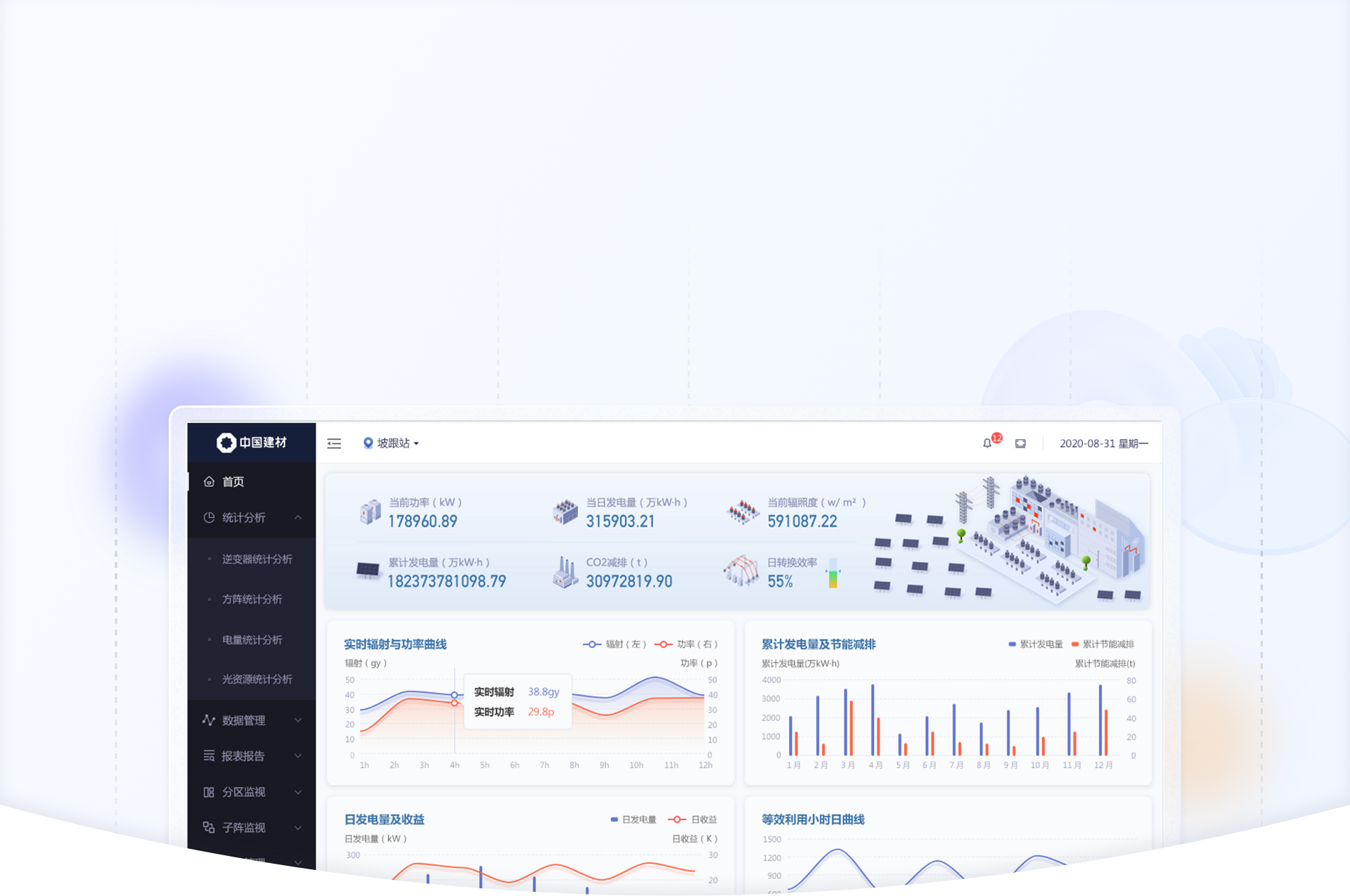 設計前期,藍藍設計通過問卷調(diào)查方式確定客戶風格和喜好,并和客戶溝通頁面交互邏輯和優(yōu)化方法,確定交互方式后,再進入視覺設計階段,這樣可以快速確定設計方向,節(jié)省大量時間。視覺設計方面,藍藍設計嘗試將2.5d圖標融入界面設計中,通過立體化,場景化的圖標,更加直觀地展示出產(chǎn)品功能屬性和使用場景,為光伏電站UI設計方向提供藍藍的設計方案。
