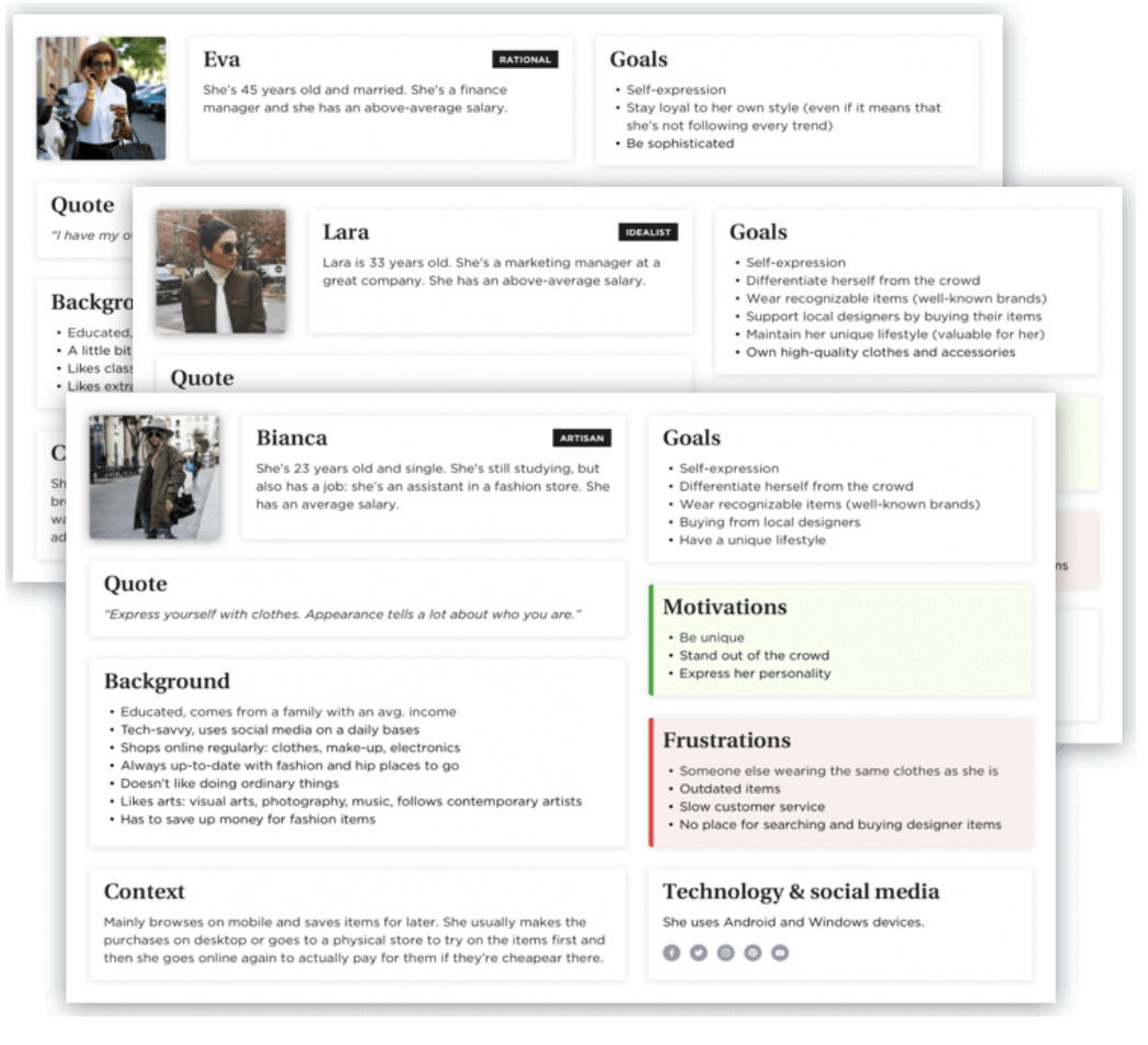 按照我們的邏輯順序,首先是創(chuàng)建角色。我們幾乎在所有項(xiàng)目中都會(huì)使用?;谖覀兊漠a(chǎn)品或服務(wù)的目標(biāo)群體,即不同的潛在客戶,構(gòu)建虛構(gòu)人物個(gè)性。這個(gè)工具可以讓我們更多地了解客戶的需求、問題、動(dòng)機(jī)和行為。我們通過研討會(huì)、頭腦風(fēng)暴或通過定性和定量研究“簡單地”收集盡可能多的數(shù)據(jù)來實(shí)現(xiàn)這一目標(biāo)。
