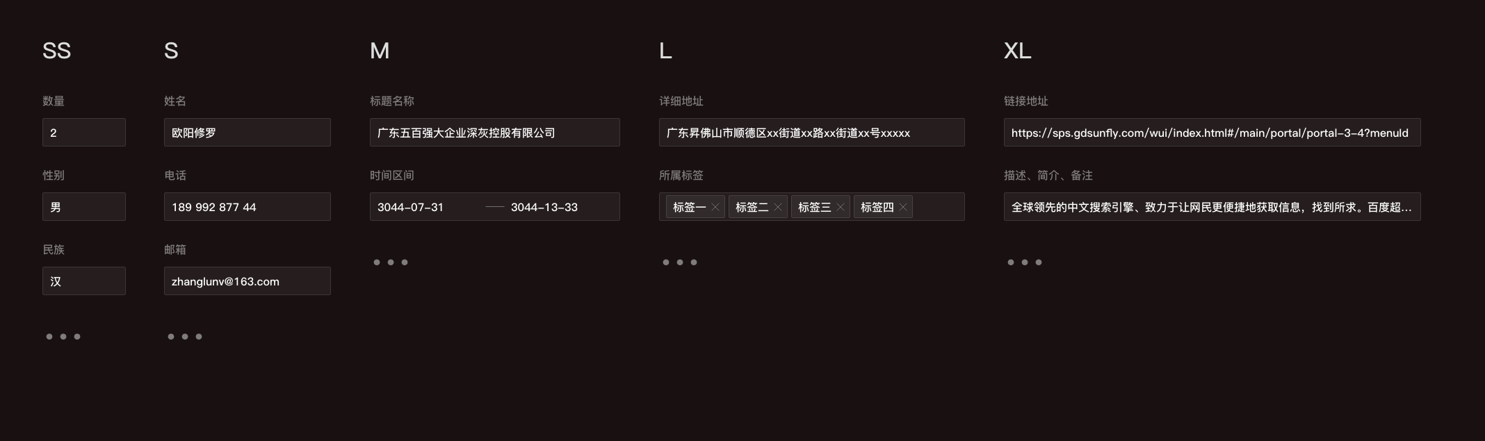 超短(XS):用于短數(shù)字、超短文本 短(S):適用于較短文本輸入,如個(gè)人信息(姓名、電話、郵箱等) 標(biāo)準(zhǔn)(M):默認(rèn)輸入框長度,適用大多數(shù)情況 長(L):適用較長文本輸入,如網(wǎng)頁地址、標(biāo)簽組等 超長(XL):適用超長文本輸入如正文(描述信息、備注、摘要、介紹、備注)、超長鏈接等選擇合適的輸入框?qū)挾瓤梢詫κ褂谜弋a(chǎn)生一定的心理暗示從而來減輕使用者的心理負(fù)擔(dān),因?yàn)樵诳吹阶侄螛?biāo)題時(shí),心理都會(huì)產(chǎn)生對所填信息的預(yù)期,大概我要填寫什么,如果選用的輸入框?qū)挾炔缓线m一方面會(huì)對使用者造成一定的填寫負(fù)擔(dān),同時(shí)還會(huì)對用戶產(chǎn)生一定程度的誤導(dǎo)。比如:填寫戶籍所在地時(shí),如果輸入框給的太寬就會(huì)疑惑,到底應(yīng)該寫“xx省xx市”、還是應(yīng)該填到具體“省-市-區(qū)-街道-xx號”呢?當(dāng)遇到更復(fù)雜的場景和混排輸入框的情況,為了讓頁面呈現(xiàn)的內(nèi)容更加有序、整齊,可參照山歌系統(tǒng)的定義方式來定義5種梯度寬度,從而方便設(shè)計(jì)執(zhí)行和技術(shù)開發(fā)。比如定義為 A=超短(XS)的寬度;短(S)的寬度=2A+n;以此類推