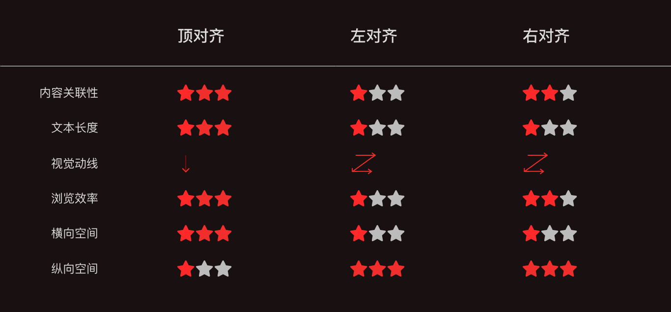 如何去選擇這三種對齊方式呢?我們從內(nèi)容關(guān)聯(lián)性、標(biāo)題長度的靈活性、空間的占比、閱讀體驗(yàn)等幾個(gè)維度進(jìn)行優(yōu)劣分析。