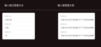 采用這樣的處理方式時(shí),需要控制表單內(nèi)輸入內(nèi)容的長度高度一致,不然會(huì)面臨以下兩種尷尬:面對尷尬一(長度定太短)內(nèi)容擴(kuò)展性太差,無法同時(shí)滿足大段信息展示。面對尷尬一(長度定太長)輸入框當(dāng)只填寫一兩個(gè)字符時(shí),會(huì)很空視覺效果不佳。