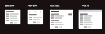 表單在設(shè)計(jì)時(shí)需要對其進(jìn)行合理的歸納簡化,降低表單填寫負(fù)荷。 通常我們將表單分為基礎(chǔ)表單、分步表單、錨點(diǎn)定位、標(biāo)簽頁這幾類。