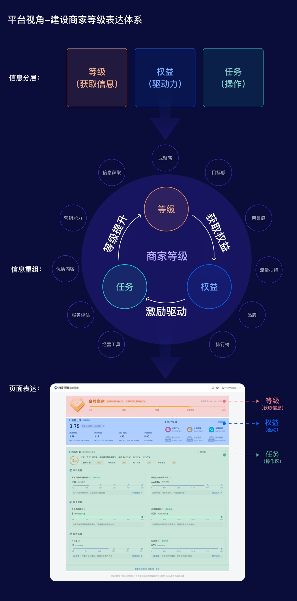 信息分層:開始頁面設(shè)計(jì)之前需要設(shè)計(jì)信息結(jié)構(gòu)和組織方式,以便商家可以輕松找到需要的信息。以商家等級為例,首先根據(jù)信息價值將信息分為<等級-權(quán)益-任務(wù)>三大類(等級作銜接、權(quán)益提供驅(qū)動力、任務(wù)是需完成的動作)。