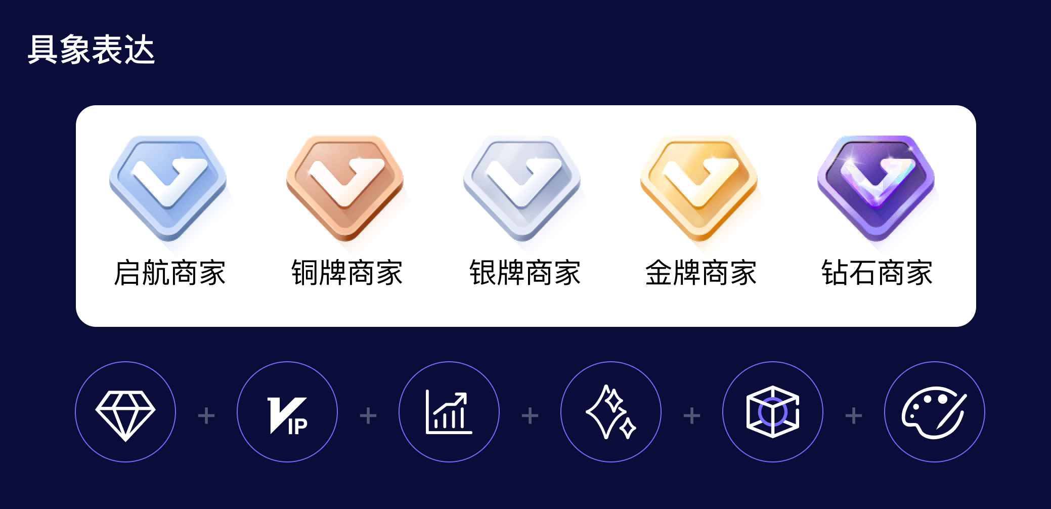 設(shè)計(jì)的基本出發(fā)點(diǎn)是幫助業(yè)務(wù)建設(shè)平臺等級模型的表達(dá)體系,將業(yè)務(wù)目標(biāo)轉(zhuǎn)化為用戶行為,設(shè)計(jì)清晰而直觀的商家分層表達(dá)體系,將不同商家等級與其對應(yīng)的特權(quán)、服務(wù)等信息進(jìn)行明確的關(guān)聯(lián)和傳達(dá),以便商家能夠快速理解和辨識商家等級的差異和優(yōu)勢。