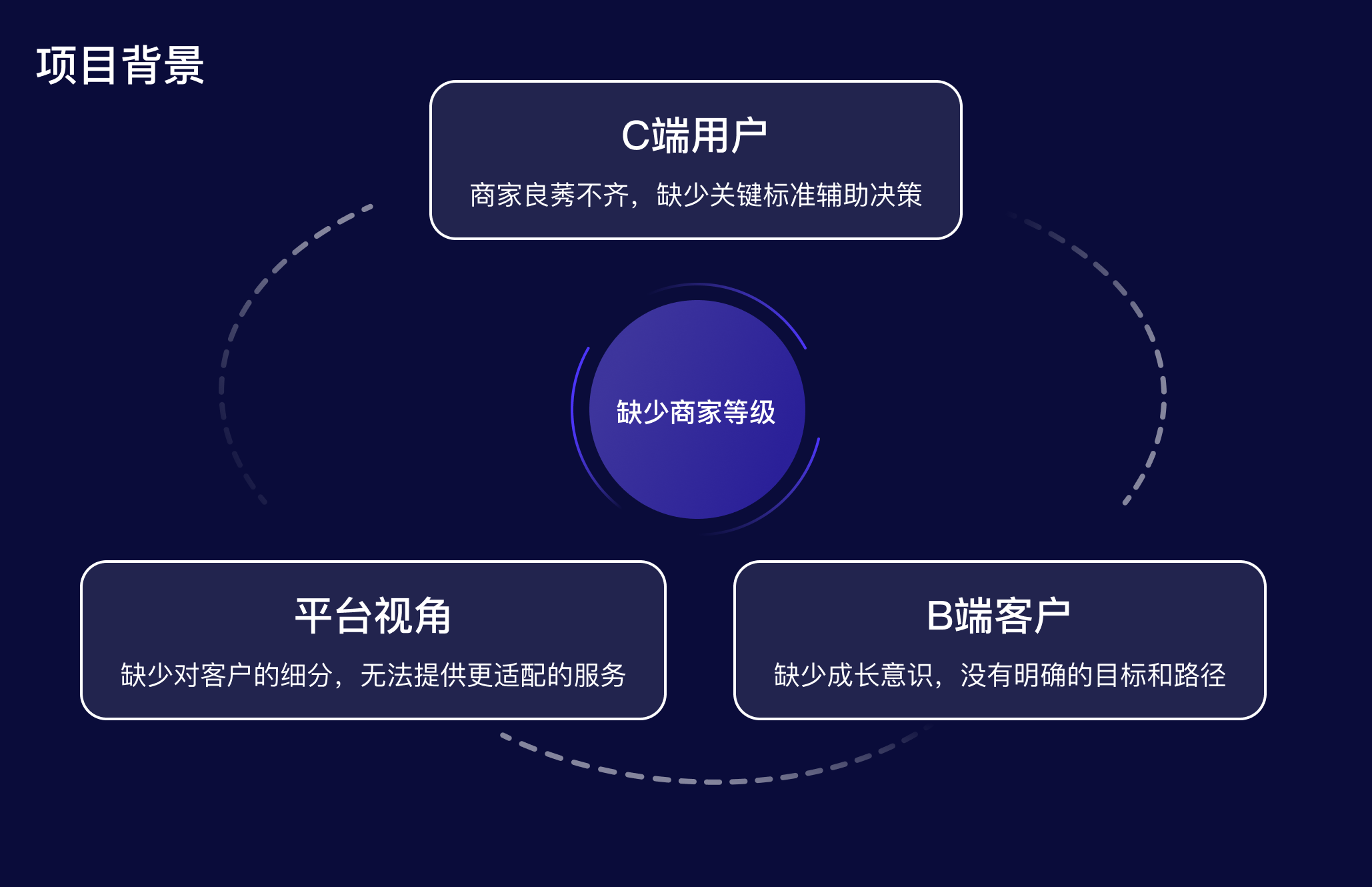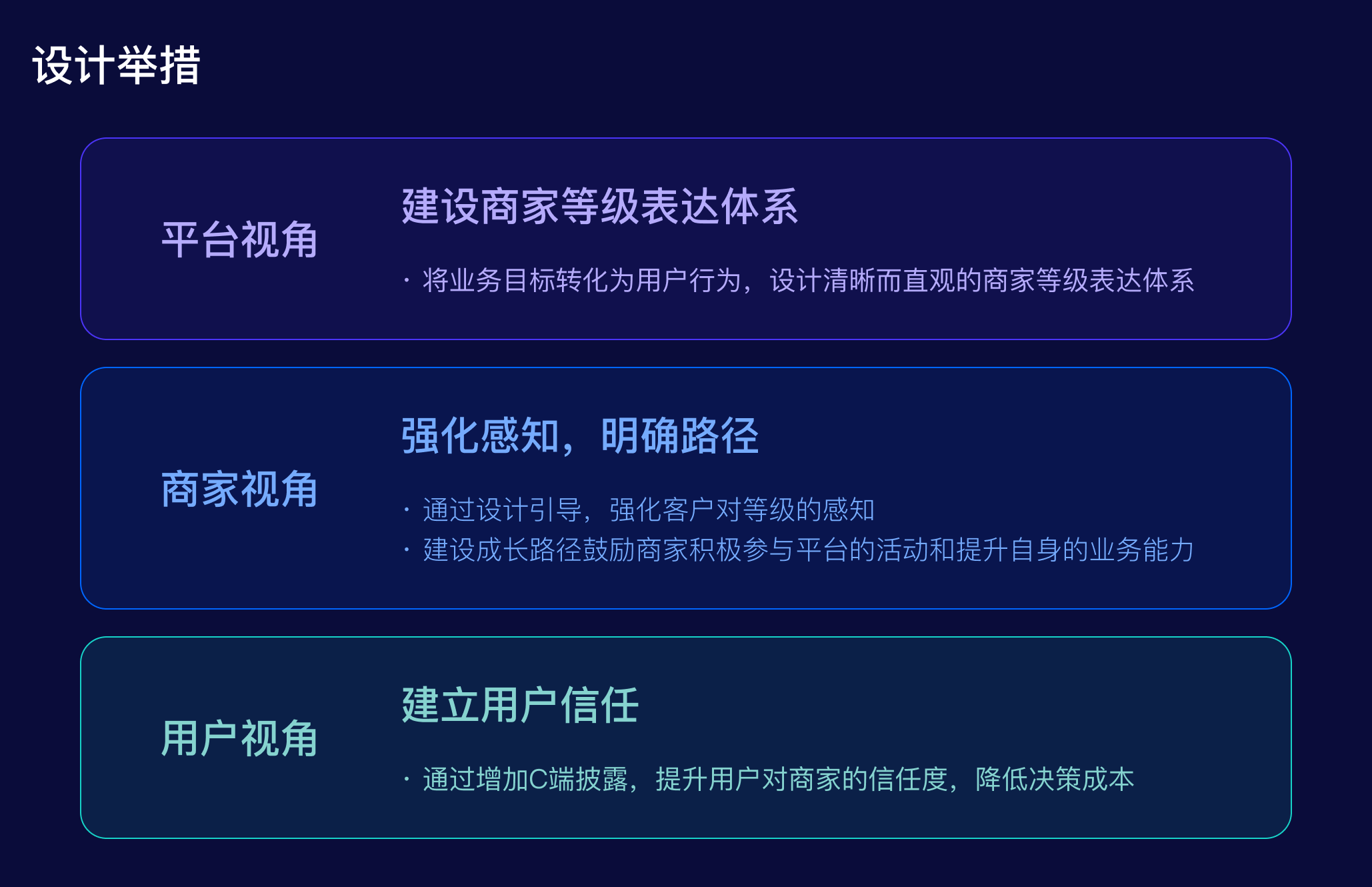 在設(shè)計(jì)之初,我們從不同的視角思考,對目標(biāo)進(jìn)行拆解和分析以獲得更全面、更多維的解決方案。從平臺視角分析,通過商家等級希望幫助商家快速定位服務(wù)短板,并提供有針對性的運(yùn)營優(yōu)化策略,從而提高商家質(zhì)量和粘性;商家視角則希望通過商家等級獲得更多權(quán)益加持,從而提升轉(zhuǎn)化;C端用戶視角希望通過商家等級,幫助降低決策成本,建立更多信任。