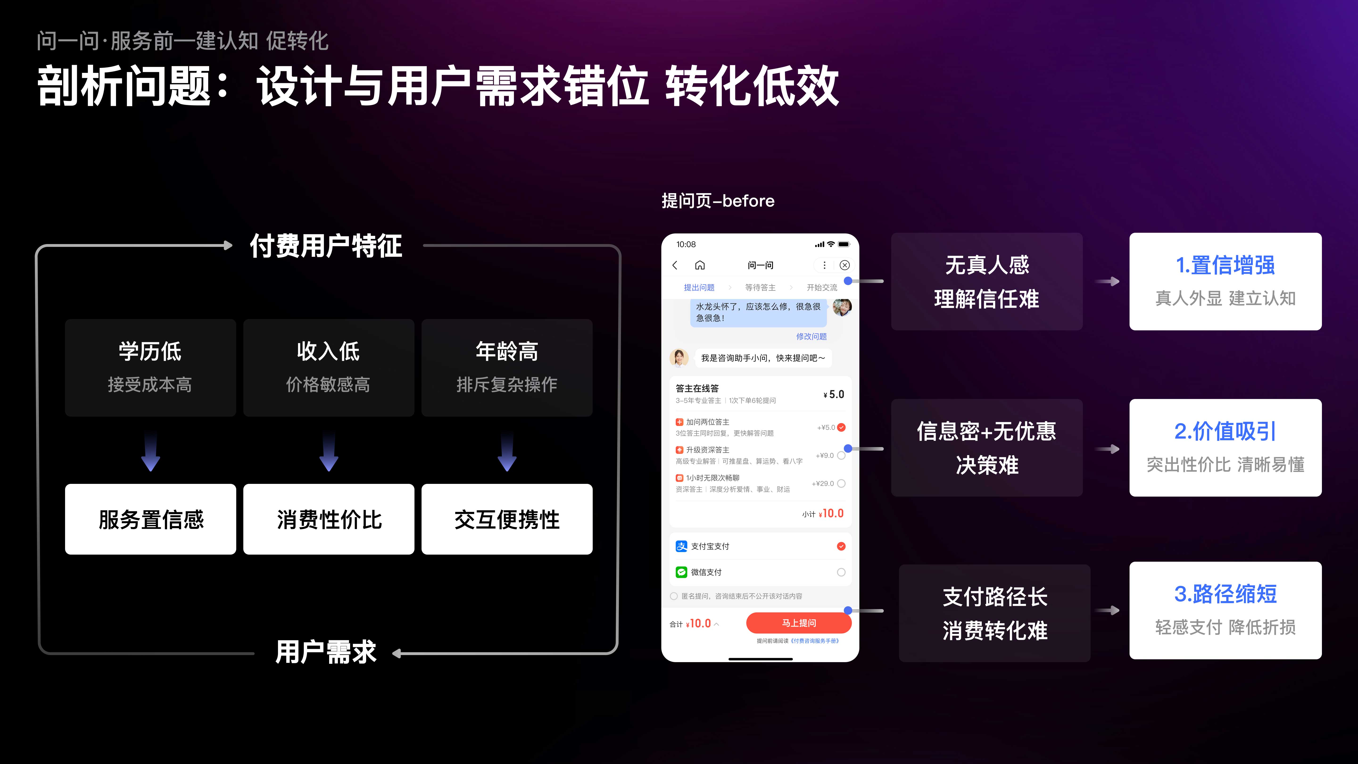 提問(wèn)是服務(wù)閉環(huán)的起點(diǎn),也是業(yè)務(wù)的核心創(chuàng)收?qǐng)鼍?。在舊版提問(wèn)頁(yè)中,服務(wù)價(jià)值的傳遞與我們“價(jià)格高敏”的主流客群需求發(fā)生錯(cuò)位,服務(wù)的置信感、吸引力、易用性都有提升空間。因此,在新版方案中,我們通過(guò)三大設(shè)計(jì)手段綜合解決:前序鋪墊環(huán)節(jié)多點(diǎn)位透?jìng)髡嫒朔?wù)感知,商品選擇環(huán)節(jié)通過(guò)突出價(jià)值對(duì)比和優(yōu)惠感來(lái)加速?zèng)Q策,壓縮步長(zhǎng)打造輕量支付體驗(yàn)降低付費(fèi)焦慮感。