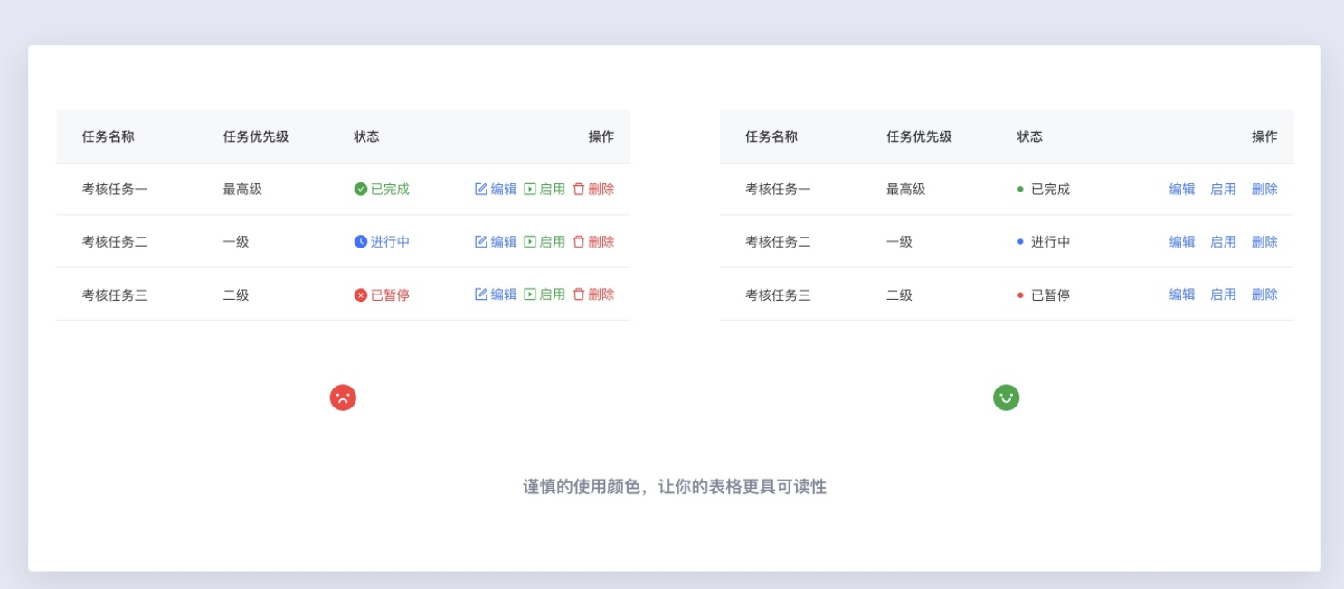 表格設計中一定不要使用過多的顏色區(qū)做狀態(tài)或操作的區(qū)分,過多的顏色細分會使表格變得更加混亂,影響用戶體驗。對狀態(tài)的區(qū)分,僅用輕量的顏色區(qū)分即可,操作欄保持主色按鈕色。