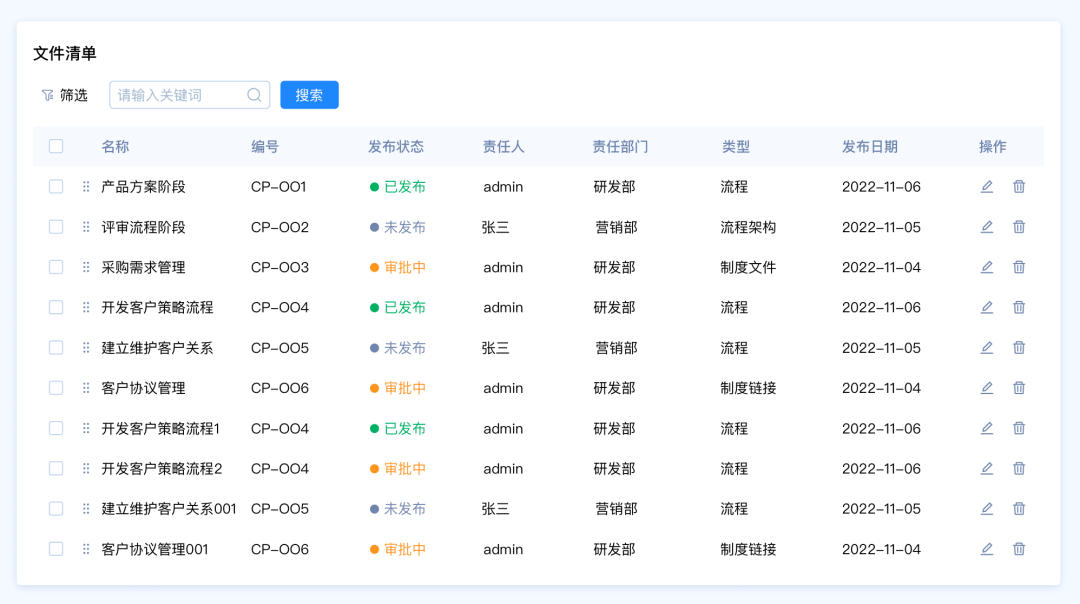 需求背景:客戶A想要快速篩選文件清單中發(fā)布狀態(tài)為“審批中”的數(shù)據(jù),希望能夠直接看到文件的狀態(tài)類型,快速選擇類型。