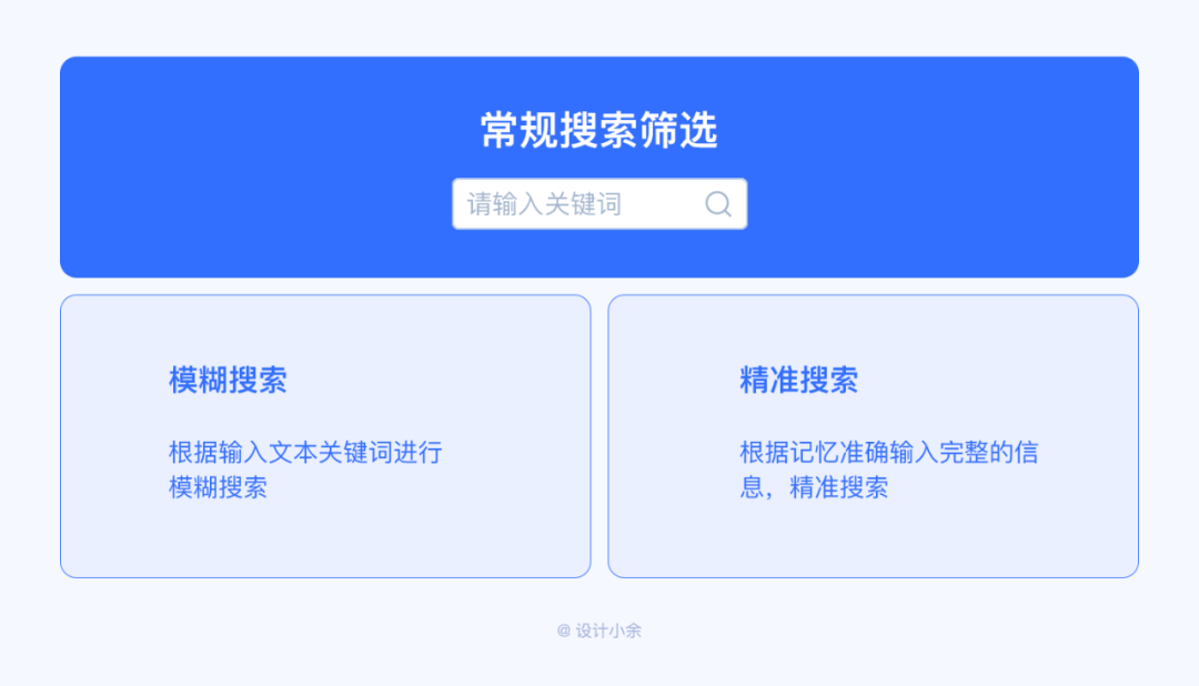 常規(guī)的搜索篩選不難理解,即常見的搜索框,根據(jù)輸入文本關(guān)鍵詞進(jìn)行模糊搜索或者根據(jù)記憶準(zhǔn)確輸入完整的信息,精準(zhǔn)搜索。文本關(guān)鍵詞搜索需要通過(guò)用戶的記憶來(lái)完成,只有當(dāng)用戶對(duì)需要搜索的內(nèi)容(關(guān)鍵詞)有記憶才能完成搜索篩選,搜索的結(jié)果范圍根據(jù)關(guān)鍵詞的精準(zhǔn)度而定。
