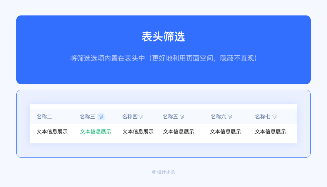 將篩選選項(xiàng)內(nèi)置在表頭中(更好地利用頁(yè)面空間,隱蔽不直觀)。當(dāng)頁(yè)面空間有限時(shí),可以考慮此方案。另外當(dāng)表格表頭字段數(shù)據(jù)較多時(shí),需要橫向滑動(dòng)查看數(shù)據(jù)時(shí),建議還是直接將篩選條件單獨(dú)放在外面。或者當(dāng)需要篩選的選項(xiàng)太多時(shí),表頭字段都能篩選時(shí),也可以考慮放在表頭中。