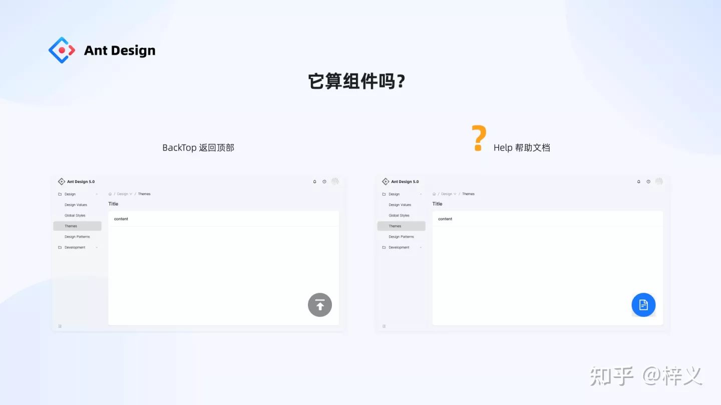 第三個(gè)問題,BackTop 組件在 Ant Design 4.0 之前作為一個(gè)獨(dú)立組件而存在,請(qǐng)問,它真的算是一個(gè)組件類型嗎?如果算,那右邊這種情況是否應(yīng)該歸為新的一類組件?