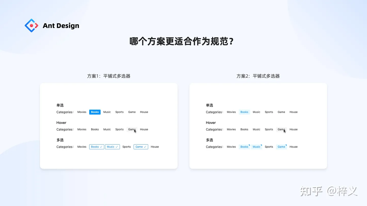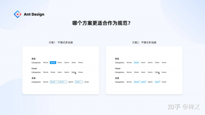 最后一個(gè)問題,某設(shè)計(jì)系統(tǒng)需要建設(shè)平鋪式多選器這樣一類組件,我們有兩位設(shè)計(jì)師出了兩套方案,請(qǐng)問哪個(gè)方案更適合作為規(guī)范納入到設(shè)計(jì)系統(tǒng)當(dāng)中呢?