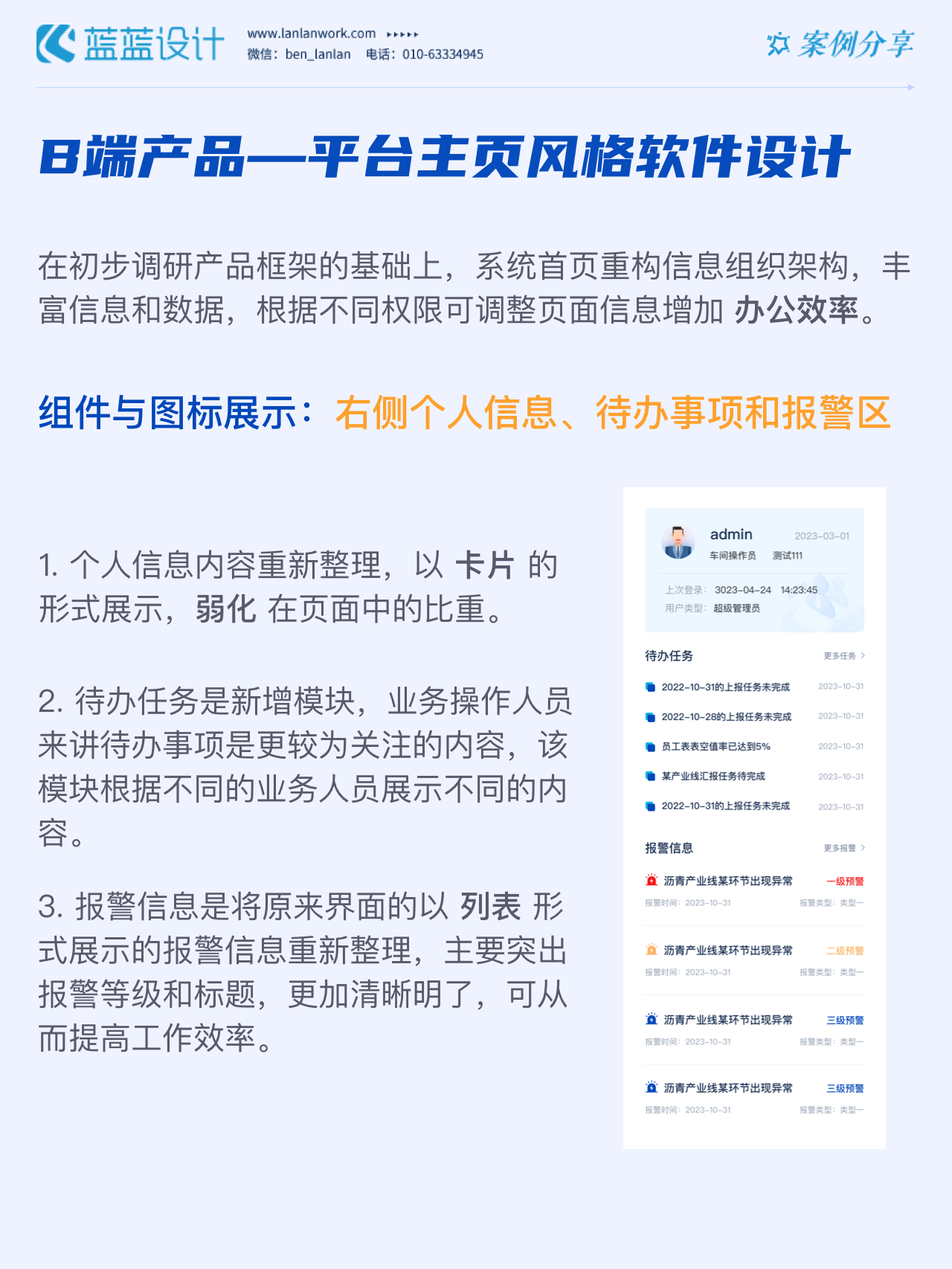 方案二:平臺主頁風格 在初步調(diào)研產(chǎn)品框架的基礎(chǔ)上,系統(tǒng)首頁重構(gòu)信息組織架構(gòu),豐富信息和數(shù)據(jù),根據(jù)不同權(quán)限可調(diào)整頁面信息增加辦公效率。設計風格采用簡約的設計語言,模塊化布局,方圓并構(gòu)的設計模式,界面強調(diào)可復用性和通用性,配色采用品牌色,品牌融合度高。