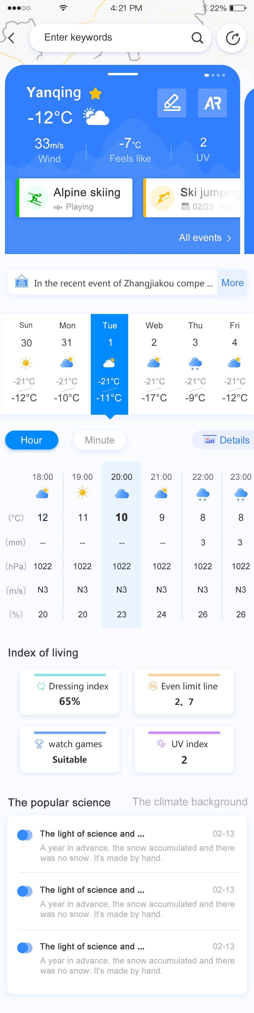 冬奧智慧氣象 APP 是專門面向國內(nèi)外 IOC(國際奧委會)官員、冬奧會的組織與管理者、運動員與教練員以及關(guān)注冬奧會比賽進程的公眾用戶,通過該 APP 向國內(nèi)、國外用戶提供權(quán)威、準確、及時的官方氣象服務(wù)信息,并作為冬奧會官方氣象服務(wù)網(wǎng)站的有力補充,通過智能手機向用戶提供優(yōu)質(zhì)的冬奧氣象服務(wù)。該 APP 以冬奧比賽場地的預(yù)報、實況和預(yù)警的氣象服務(wù)為設(shè)計重點,面向不同用戶的天氣需求進行定制化開發(fā)。開發(fā)原則上以服務(wù)用戶為主,創(chuàng)新設(shè)計服務(wù)流程和服務(wù)模式,讓國內(nèi)外用戶能夠體驗到冬奧氣象服務(wù)的實用和貼心,并具有一定的科技感和獲得感。