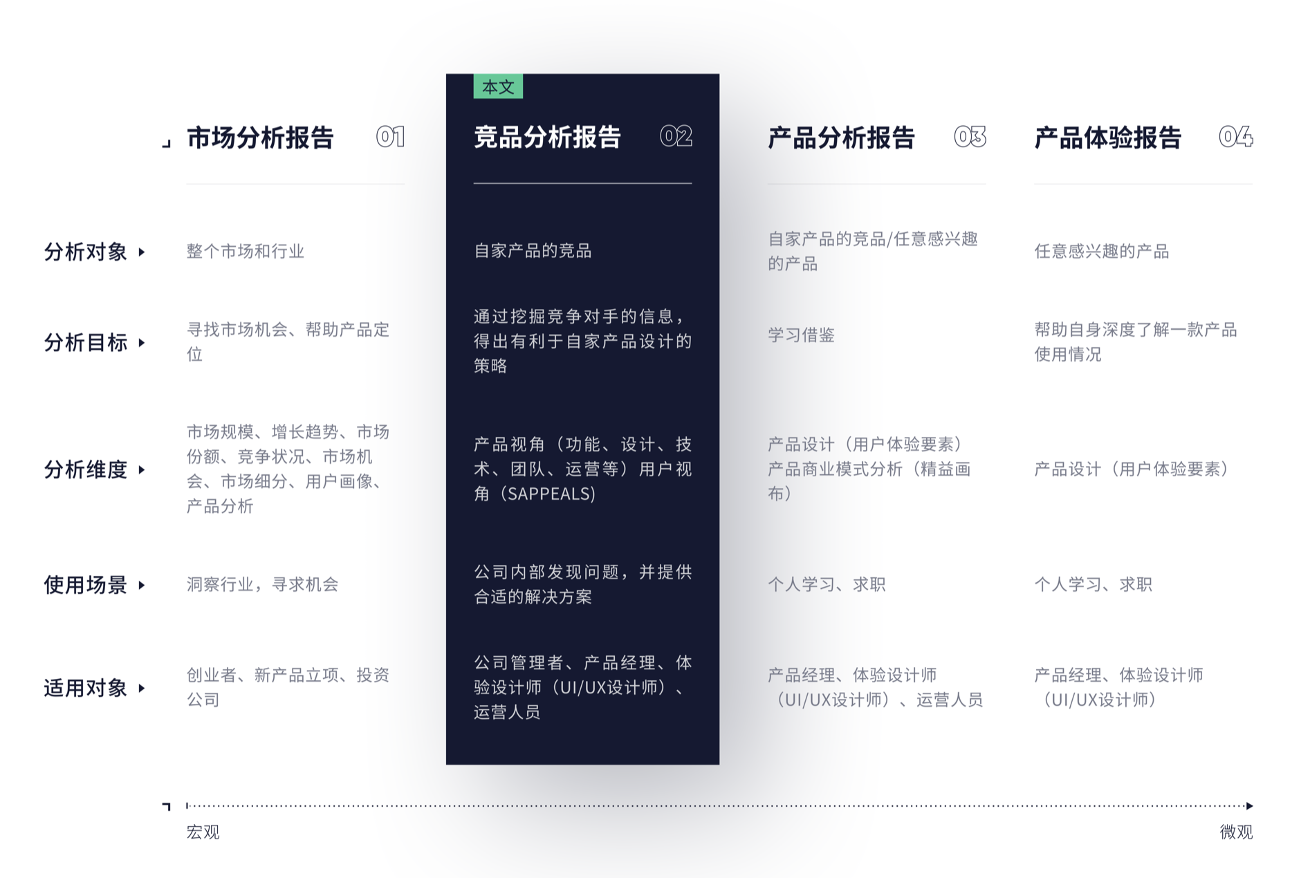- 競品分析報告:分析對象是自家產(chǎn)品的競品,目標是學習借鑒,分析維度為產(chǎn)品分析,使用場景是公司內(nèi)部發(fā)現(xiàn)問題并提供參考,適用對象是產(chǎn)品經(jīng)理、體驗設計師等。