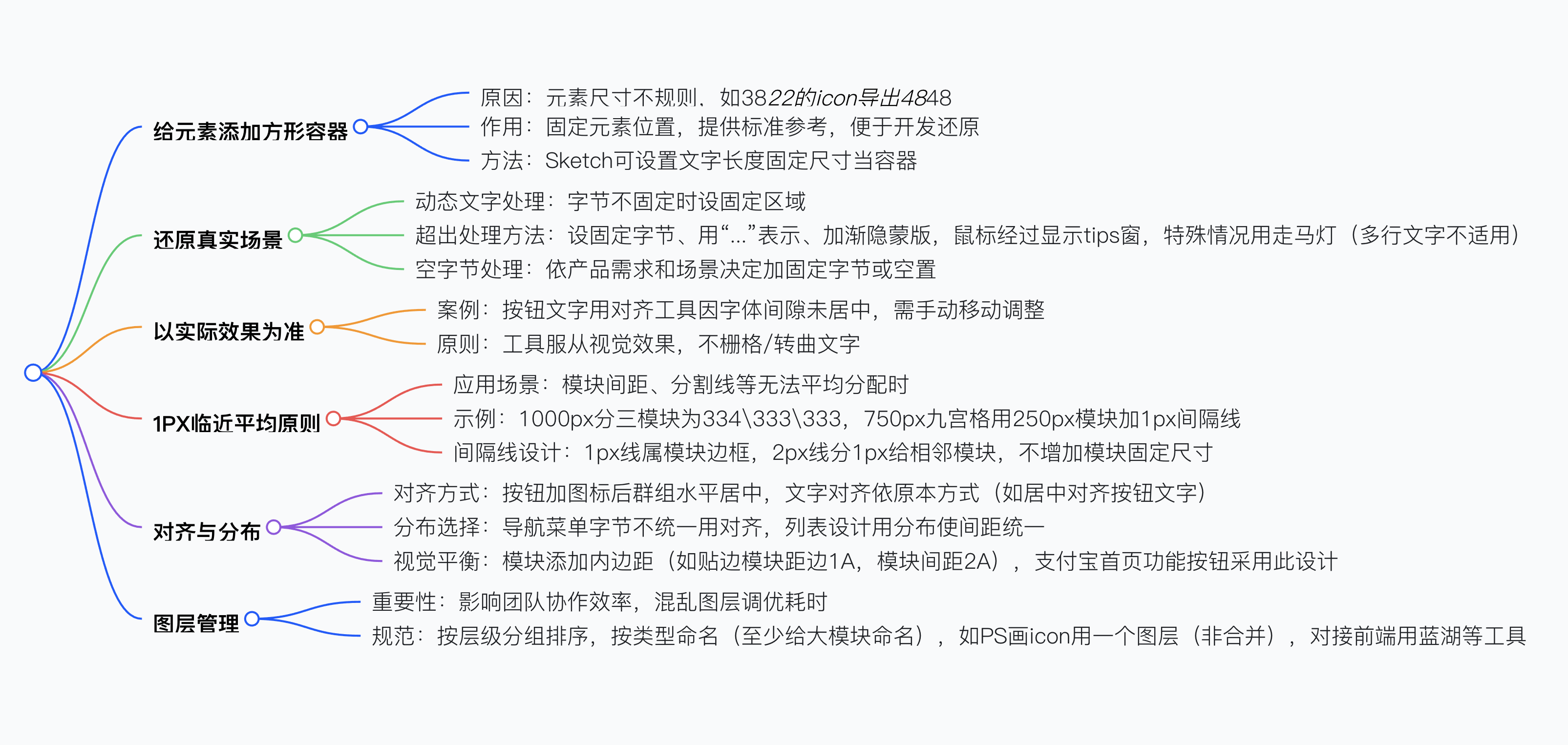 UI 設(shè)計(jì)需死摳細(xì)節(jié),包括給元素添加方形容器以固定位置方便開發(fā)還原,盡可能還原真實(shí)場(chǎng)景如處理動(dòng)態(tài)文字字節(jié)用省略號(hào)、漸隱蒙版或 tips 窗,以實(shí)際效果為準(zhǔn)調(diào)整文字對(duì)齊(如手動(dòng)移動(dòng)解決字體間隙問題),遵循 1PX 臨近平均原則處理無法均分的尺寸(如 334\333\333 的分配),注意對(duì)齊與分布(如導(dǎo)航菜單按需求選擇對(duì)齊或分布方式并添加內(nèi)邊距實(shí)現(xiàn)視覺平衡),以及做好圖層管理(按層級(jí)分組命名以提高協(xié)作效率),這些細(xì)節(jié)體現(xiàn)設(shè)計(jì)師專業(yè)素養(yǎng)并提升設(shè)計(jì)質(zhì)量。