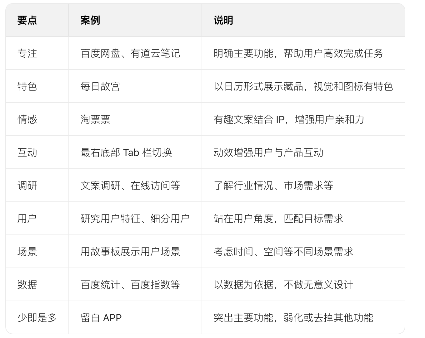 - 答案:設(shè)計(jì)前的案例分析包含專(zhuān)注(明確主要功能)、特色(區(qū)別于同行的功能、體驗(yàn)或視覺(jué))、情感(加入情感化設(shè)計(jì))、互動(dòng)(運(yùn)用動(dòng)效)、調(diào)研(了解行業(yè)和市場(chǎng))、用戶(hù)(研究用戶(hù)特征和需求)、場(chǎng)景(考慮用戶(hù)使用場(chǎng)景)、數(shù)據(jù)(以數(shù)據(jù)為設(shè)計(jì)依據(jù))、少即是多(突出主要功能)這 9 個(gè)關(guān)鍵要點(diǎn)。