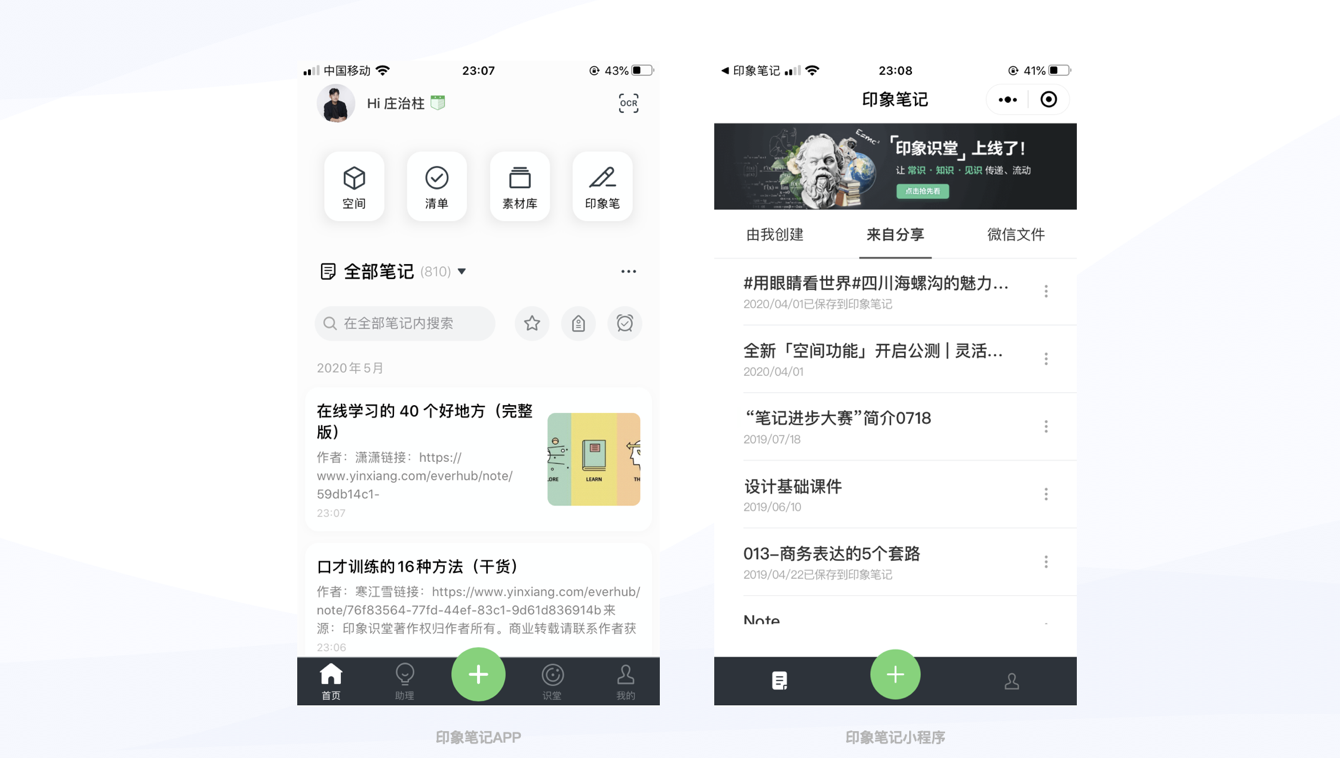 - 筆記類(如印象筆記):突出 “由我創(chuàng)建”“來自分享”“微信文件” 三個核心入口,方便用戶通過微信快速收集分享筆記,還支持一鍵導入微信文件,避免文件過期;