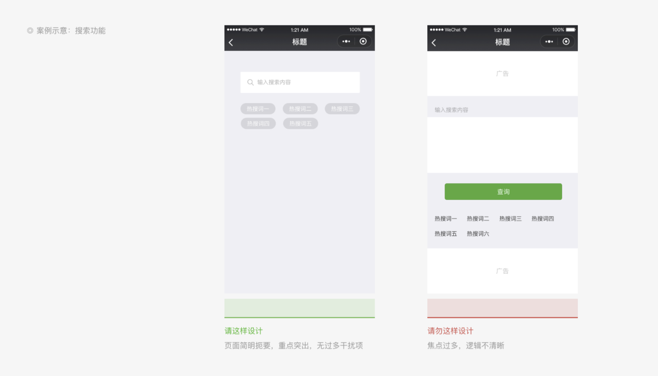 - 重點突出:頁面需簡明,聚焦核心內(nèi)容,避免多焦點干擾。例如搜索功能應減少無關熱搜詞,多按鈕設計需明確主次(如主操作按鈕突出,輔助操作弱化);