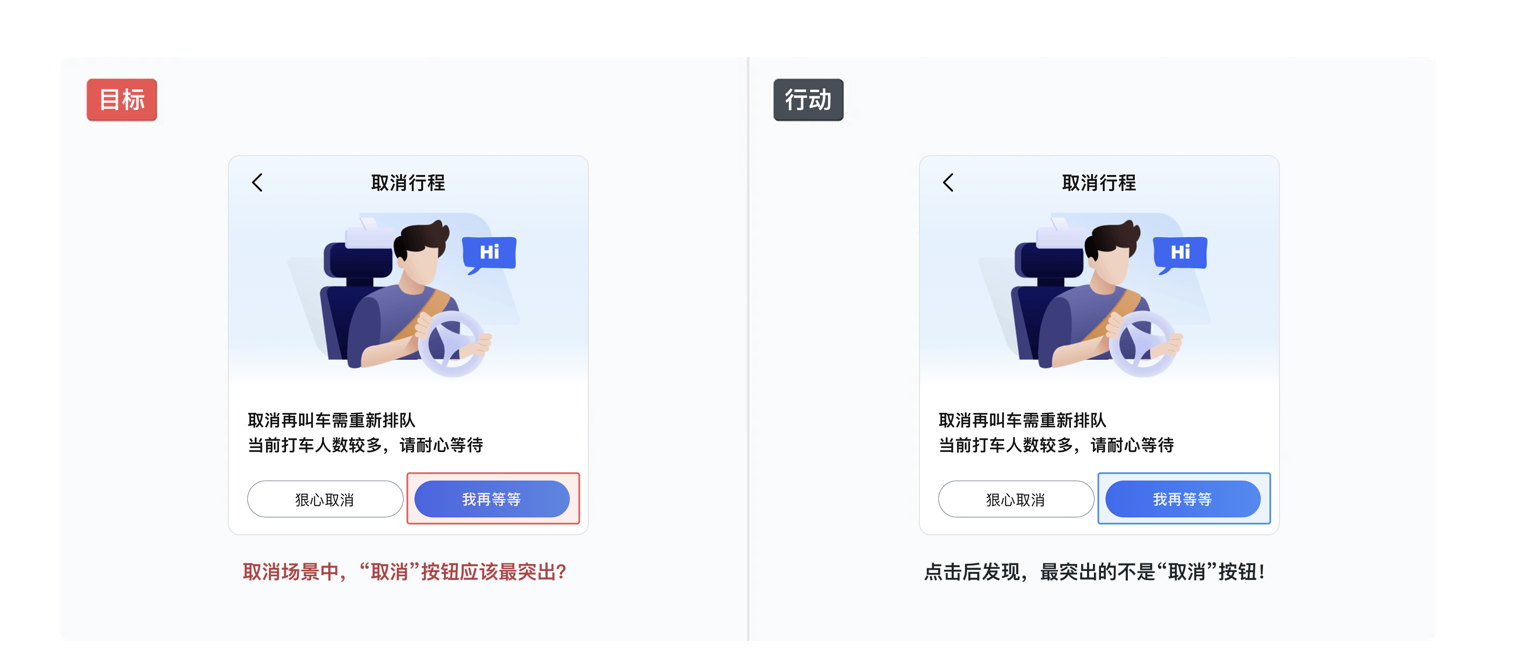 比如看到 APP 里一個顯眼的紅色按鈕,以為是 “返回”,點擊后卻發(fā)現(xiàn)是 “提交訂單”;在打車軟件里,把 “狠心取消” 當(dāng)成 “查看詳情”。這種錯誤源于 “規(guī)劃階段”,是界面信息混亂、層級不清晰導(dǎo)致的 —— 用戶不是手滑,是被設(shè)計 “誤導(dǎo)” 了。