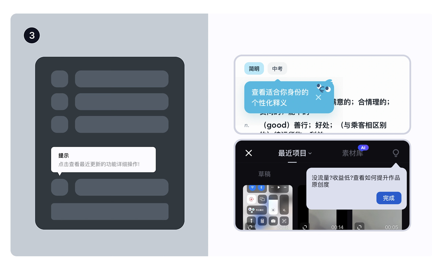 當(dāng)用戶第一次點(diǎn)擊某個(gè)功能(比如新按鈕、新模塊)時(shí),用小氣泡給出簡(jiǎn)短說(shuō)明,不打斷操作流程,很適合功能細(xì)節(jié)引導(dǎo)。