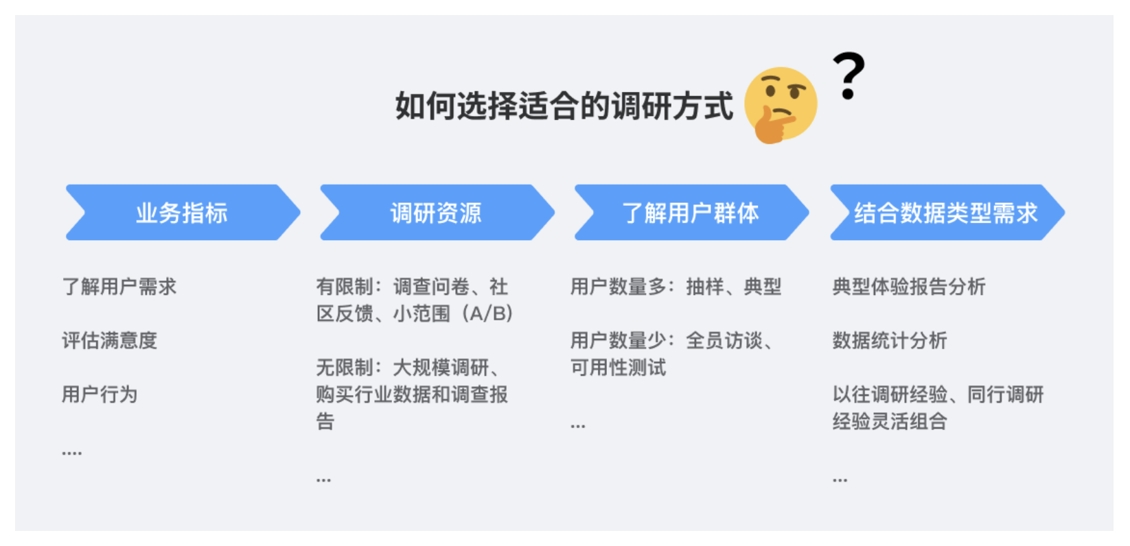 用戶(hù)分析的核心是 “用合適的方法,在有限資源內(nèi)找關(guān)鍵信息”,常見(jiàn)方法及適用場(chǎng)景如下: