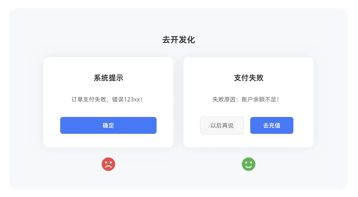 - 拒絕負(fù)面詞匯:避開(kāi) “不要”“不能”“失敗” 等詞匯,用正向表達(dá)替代,“暫未找到結(jié)果” 比 “沒(méi)有符合條件的內(nèi)容” 更溫和。