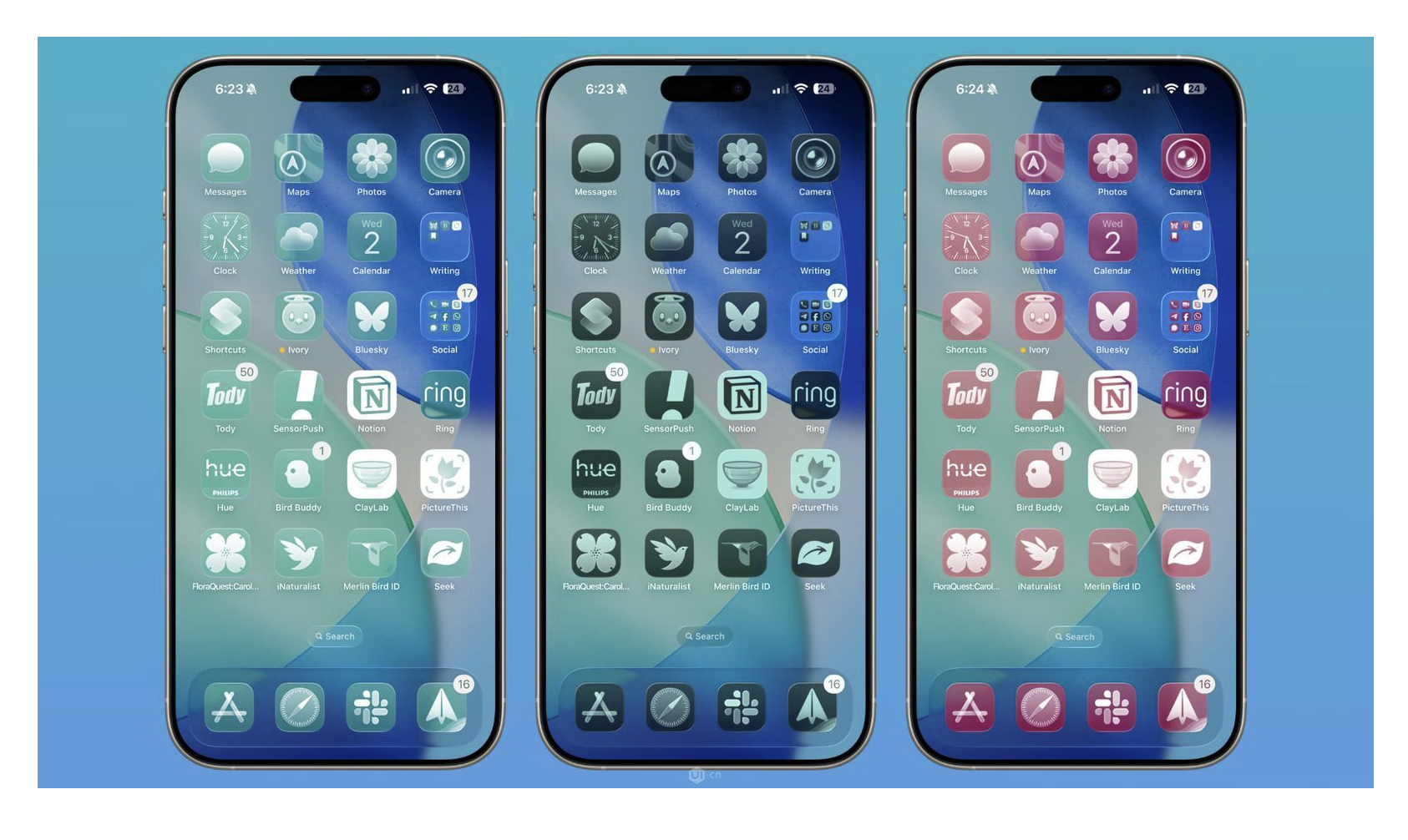 應(yīng)用圖標(biāo)采用多層玻璃堆疊設(shè)計(jì),賦予了微妙的空間深度,同時(shí)新增半透明圖標(biāo)選項(xiàng),讓桌面看起來(lái)如同一塊純凈的玻璃面板。停靠欄、搜索按鈕、應(yīng)用文件夾均實(shí)現(xiàn)透明化處理,文件夾還能根據(jù)壁紙自動(dòng)調(diào)整色調(diào),編輯主屏幕時(shí)的交互按鈕也采用透明設(shè)計(jì),讓整個(gè)界面與背景完美融合,毫無(wú)割裂感。