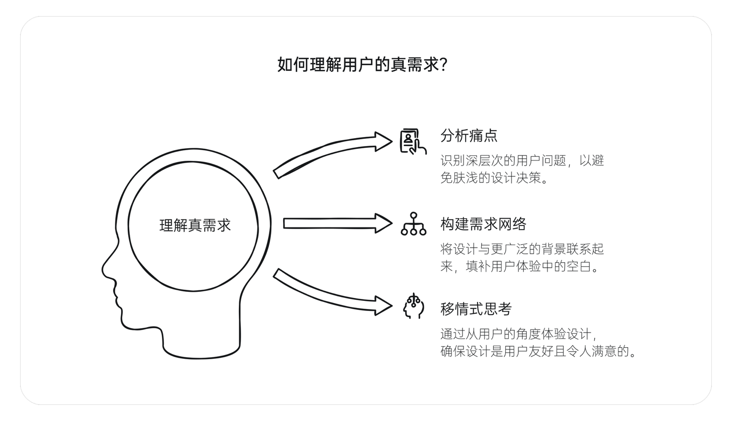 想要精準(zhǔn)捕捉真需求,設(shè)計師需要建立三維思考模式: