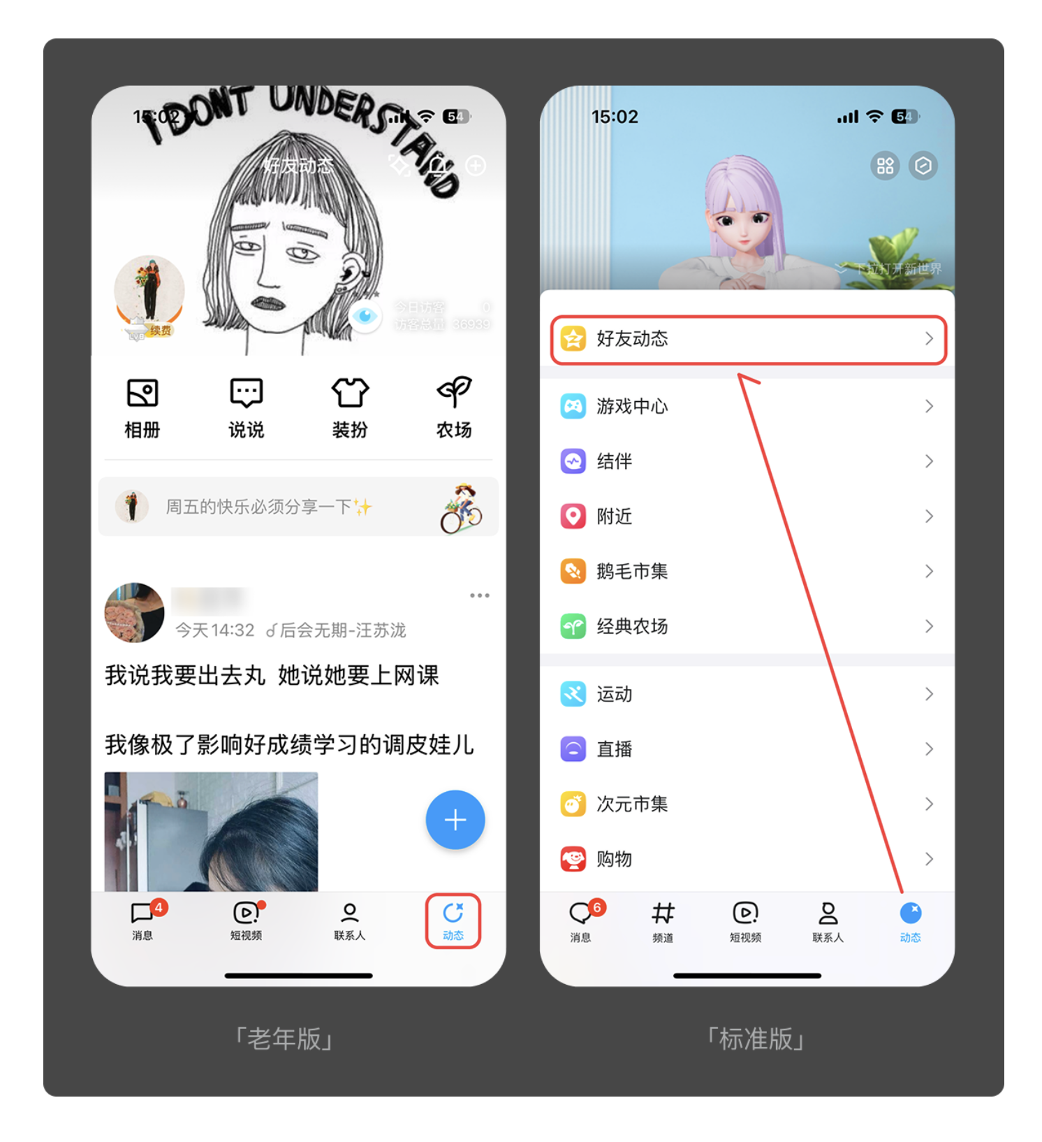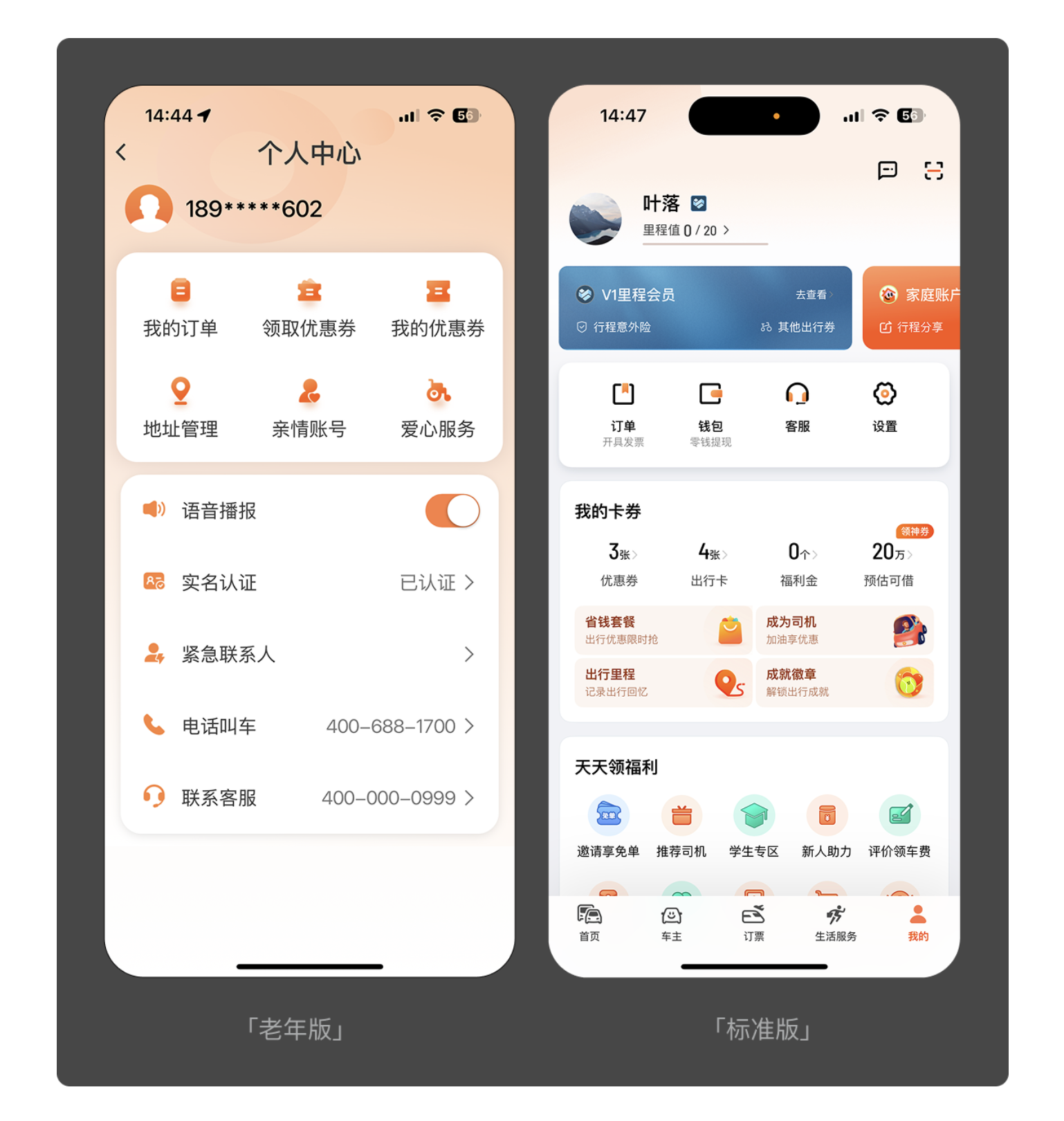 對(duì)老年人而言,多余的操作步驟就是無(wú)形的門檻。優(yōu)秀的適老化設(shè)計(jì)會(huì)砍掉非必要功能,讓核心需求一鍵直達(dá)。滴滴老年版便是典型案例:標(biāo)準(zhǔn)版需要先輸入目的地再點(diǎn)擊叫車,而老年版直接在首頁(yè)設(shè)置 “呼叫出租車” 大按鈕,省去輸入環(huán)節(jié),讓用戶無(wú)需學(xué)習(xí)就能完成叫車。QQ 老年版同樣簡(jiǎn)化了動(dòng)態(tài)查看流程,標(biāo)準(zhǔn)版需兩次點(diǎn)擊才能進(jìn)入的頁(yè)面,老年版一次點(diǎn)擊即可直達(dá),大幅提升操作效率。