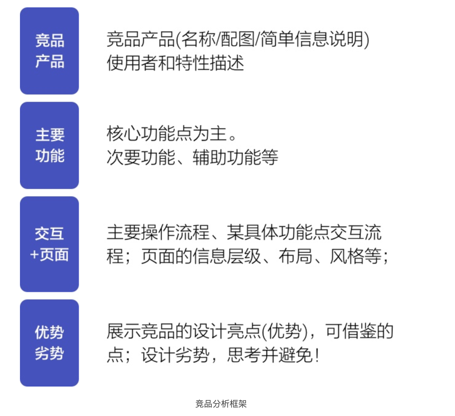 - 核心競品:產(chǎn)品功能、目標用戶、體驗?zāi)繕烁叨认嗨?,是直接競爭關(guān)系,需進行全面深入的對比分析,重點挖掘其核心優(yōu)勢與短板。