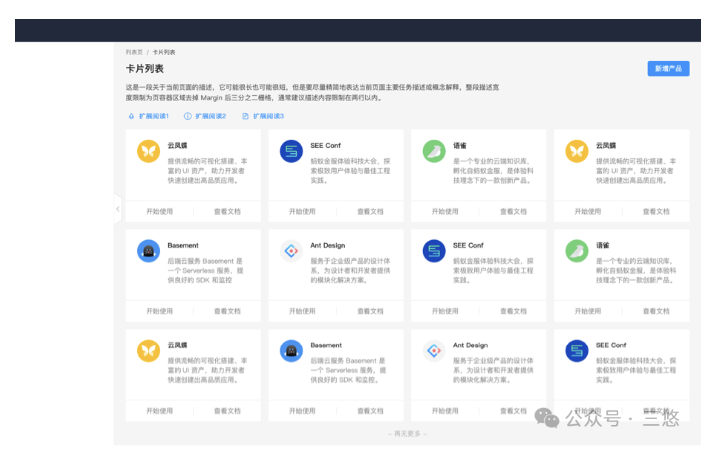 - 每個卡片包含明確的標題、簡要描述、核心功能按鈕(如 “開始使用”“查看文檔”),信息層級清晰;
