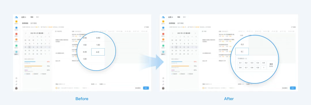 在此之前,我們的工時填報頁面,由于可輸入信息精確到小數(shù)點后兩位,所以我們常用的計步器、選擇器、滑動輸入等組件都無法在這里使用。對用戶而言,手動逐項錄入數(shù)據(jù)的操作成本非常高。