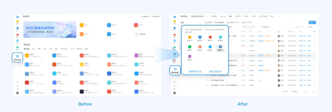在我們的平臺上,一些用戶雖然可以將自己經(jīng)常使用的應用常駐到菜單欄上,但是受限于屏幕尺寸左側的菜單欄不能顯示太多常駐應用。