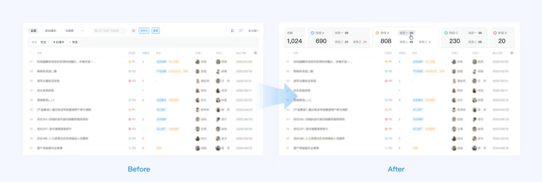 按照以往的交互,用戶可以用篩選器篩選出各階段下不同狀態(tài)數(shù)據(jù)再進行查看對比,雖然篩選器可以篩選出這些多階段、多狀態(tài)的數(shù)據(jù),但存在著篩選步驟繁瑣、多階段&多狀態(tài)的數(shù)據(jù)呈現(xiàn)都是棘手問題。