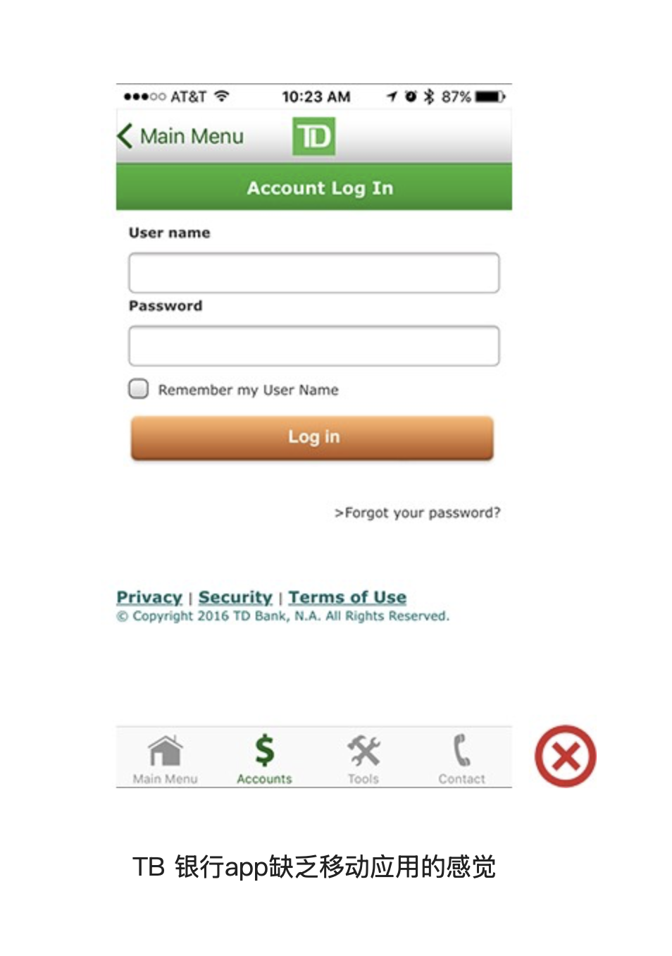網(wǎng)頁端的交互模式與頁面元素,并不完全適用于移動 App。網(wǎng)頁中常用下劃線表示超鏈接,但在移動應(yīng)用中,用戶更習(xí)慣通過按鈕完成跳轉(zhuǎn),下劃線設(shè)計(jì)會顯得突兀且不符合使用預(yù)期。曾有某銀行的 iOS 端 App,直接將網(wǎng)頁代碼包裝成應(yīng)用,界面中保留了網(wǎng)頁式的下劃線鏈接和底部版權(quán)信息,讓用戶誤以為打開的是移動網(wǎng)頁,而非原生 App,嚴(yán)重影響了產(chǎn)品的專業(yè)性與使用體驗(yàn)。