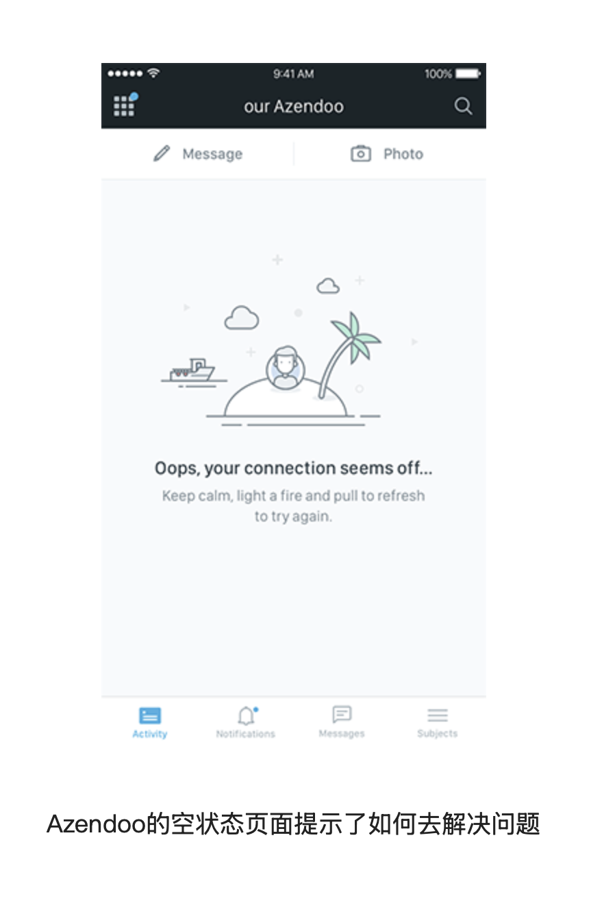 空狀態(tài)、錯(cuò)誤提示頁面不應(yīng)是毫無指引的空白界面。當(dāng)用戶遇到網(wǎng)絡(luò)斷開、操作失誤或內(nèi)容為空時(shí),空白頁面會讓用戶不知所措,甚至直接退出 App。優(yōu)秀的空狀態(tài)設(shè)計(jì)應(yīng)提供明確的解決方案 —— 比如告知用戶 “網(wǎng)絡(luò)連接失敗” 后,給出 “下拉刷新重試” 的指引;內(nèi)容為空時(shí),建議用戶 “添加第一條內(nèi)容” 并提供操作入口。某協(xié)作類 App 在網(wǎng)絡(luò)斷開時(shí),會顯示 “連接似乎中斷了... 冷靜下來,下拉刷新再試一次” 的提示,既緩解了用戶的焦慮,又給出了具體操作路徑,有效降低了用戶流失率。
