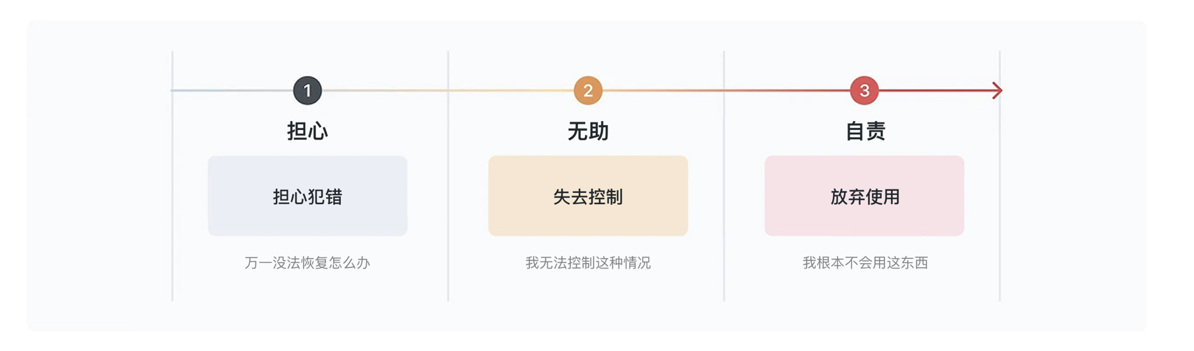 要化解錯(cuò)誤帶來(lái)的負(fù)面影響,首先需要讀懂錯(cuò)誤背后的邏輯與用戶心理。從類型上看,用戶出錯(cuò)可分為 “失誤” 與 “錯(cuò)誤” 兩類:失誤多是執(zhí)行階段的無(wú)意識(shí)行為,比如分心時(shí)點(diǎn)錯(cuò)按鈕、輸入時(shí)打錯(cuò)字符;錯(cuò)誤則源于規(guī)劃階段的判斷偏差,往往是界面信息混亂、層級(jí)模糊導(dǎo)致用戶誤解功能。無(wú)論哪種情況,用戶出錯(cuò)后的心理反應(yīng)高度一致:擔(dān)心操作不可逆的恐懼、失去對(duì)流程掌控感的無(wú)助,以及將問(wèn)題歸咎于自身的自責(zé),而自責(zé)感正是導(dǎo)致用戶放棄使用的核心誘因。尤其在操作不可逆(如刪除數(shù)據(jù)、注銷賬號(hào))、反復(fù)失?。ㄈ绲卿洺瑫r(shí)、表單校驗(yàn)不通過(guò))或高風(fēng)險(xiǎn)場(chǎng)景(如支付轉(zhuǎn)賬、數(shù)據(jù)傳輸)中,用戶的焦慮感會(huì)被急劇放大,對(duì)產(chǎn)品的信任度也會(huì)隨之崩塌。