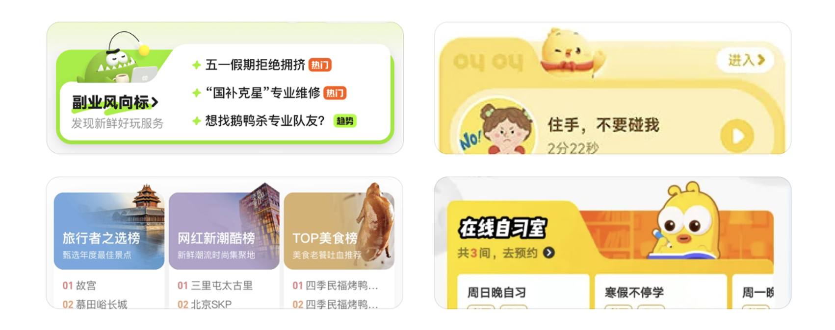 比如外賣 APP 的首頁功能區(qū),“外賣點(diǎn)餐” 是核心高頻功能,做超大卡片;“超市便利”“水果生鮮” 是次要功能,做中尺寸;“跑腿”“充值” 是輔助功能,做小尺寸。