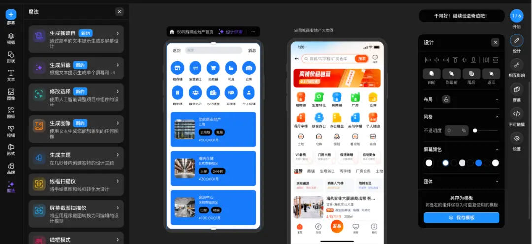 例如,設(shè)計師為 58 同城商業(yè)地產(chǎn)板塊設(shè)計移動端大類頁面時,僅需向 Uizard 明確設(shè)計需求:頭部導(dǎo)航包含返回、搜索、消息功能,入口金剛區(qū)以圖標(biāo)形式展示租賃商鋪、商業(yè)轉(zhuǎn)讓等 10 個功能,下方搭配包含圖片、標(biāo)題、標(biāo)簽、價格的推薦列表,并選擇高精度生成模式,AI 即可在幾分鐘內(nèi)完成初步的界面原型生成,大幅縮短了從草圖到數(shù)字原型的轉(zhuǎn)化時間,讓設(shè)計師能快速驗證設(shè)計概念。