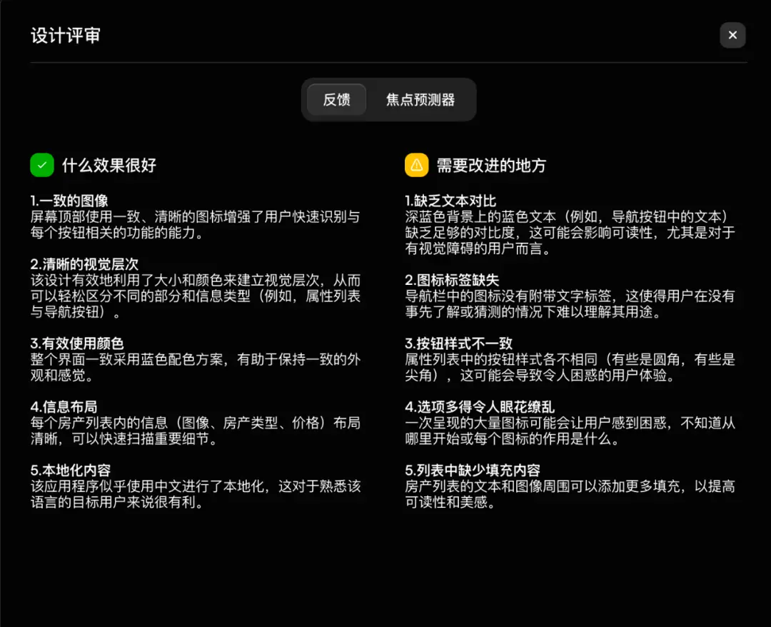 不難發(fā)現(xiàn),Uizard 能高效檢測布局、配色、組件等顯性設(shè)計問題,但無法對設(shè)計背后的業(yè)務(wù)策略與用戶心智匹配度進(jìn)行評估。