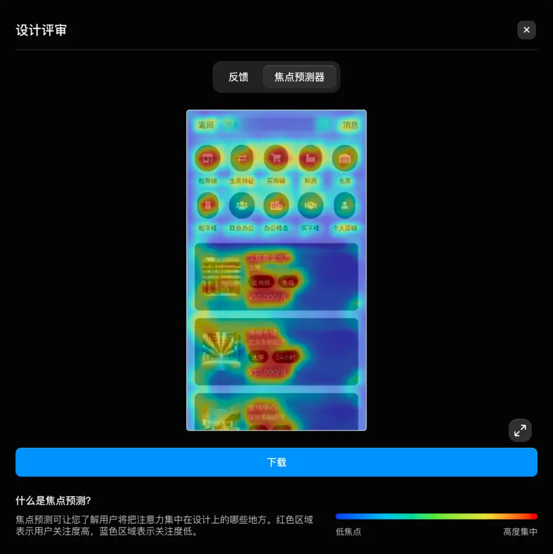 Uizard 的焦點預(yù)測功能,融合了眼動追蹤數(shù)據(jù)與機(jī)器學(xué)習(xí)算法,能精準(zhǔn)預(yù)測用戶在界面上的注視點,用紅色標(biāo)注高關(guān)注度區(qū)域、藍(lán)色標(biāo)注低關(guān)注度區(qū)域,為界面布局優(yōu)化提供核心依據(jù)。