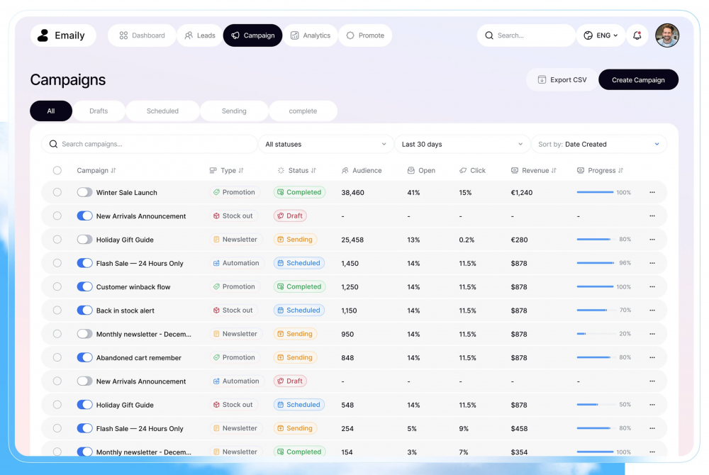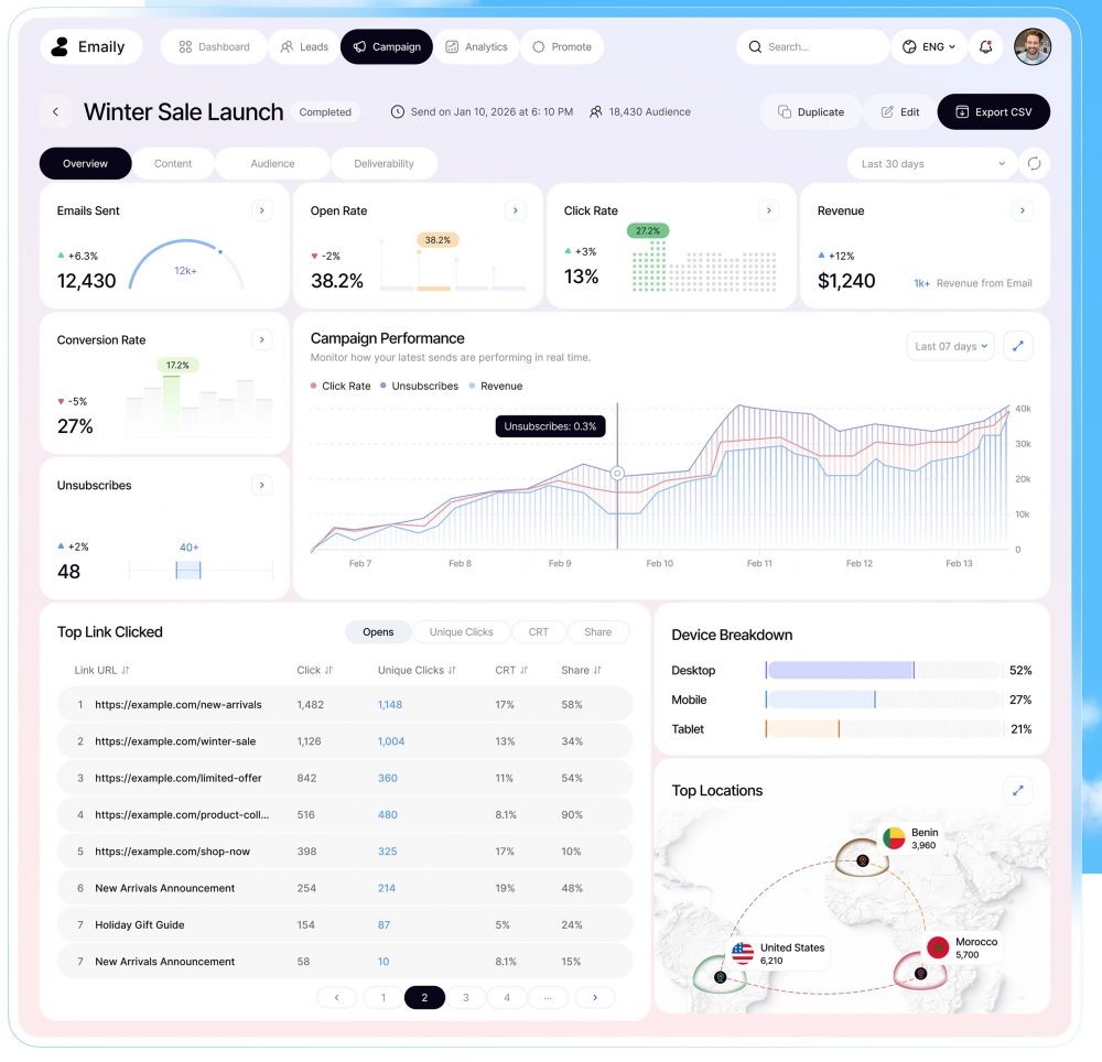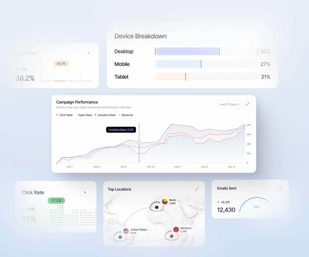 7 天點(diǎn)擊率、退訂率和收入動態(tài)變化,便于快速定位活動表現(xiàn)的起伏點(diǎn),為營銷決策提供有力依據(jù),是分析郵件營銷活動效果的重要方