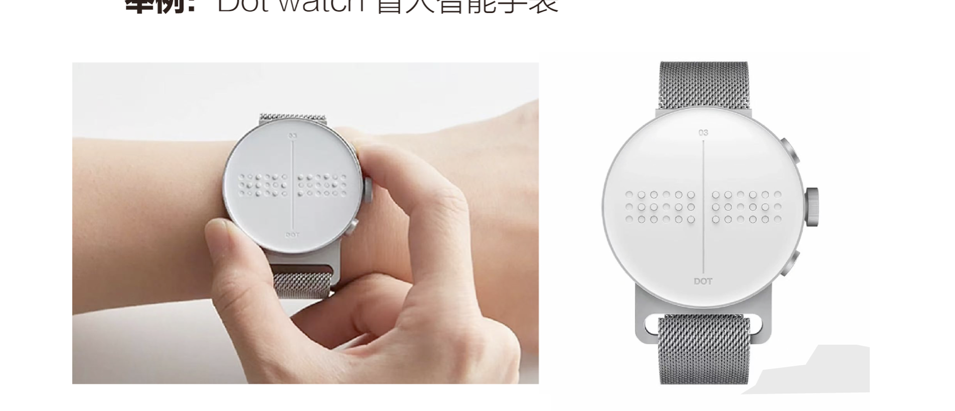 韓國 Dot Incorporation 公司研發(fā)的 Dot watch 盲人智能手表,則讓盲文與現(xiàn)代科技完美融合。表盤的 24 個盲點(diǎn)可通過上下浮動形成盲文凸點(diǎn),不僅能清晰 “訴說” 時間,還能將短信、社交信息、來電姓名與號碼實(shí)時轉(zhuǎn)化為盲文,讓視障人群無需等待即可獲取信息;同時,手表支持私密瀏覽備忘錄,真正打破了視障人群的信息接收壁壘,讓科技為盲文賦能,讓設(shè)計服務(wù)于生活。