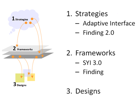 你可以從中看到自己的影響力到哪,一個設(shè)計師如果是精于designs,那你是個很好的設(shè)計助理,如果能能對frameworks提出成熟方案,那應(yīng)該是個很合格的交互設(shè)計師了,如果你對strategies有影響,甚至有一定決策權(quán),那恭喜你,你理所當(dāng)然應(yīng)該得到所有HCIer的尊重。