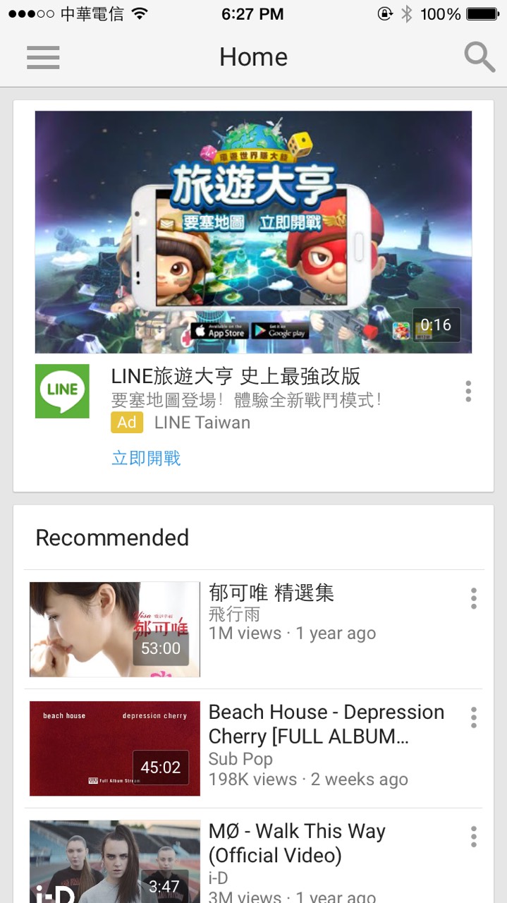 例如 YouTube 應(yīng)用一點(diǎn)開,你就知道這個應(yīng)用的基礎(chǔ)內(nèi)容是什麼了。下面有推薦的內(nèi)容,第一欄的 Home bar 則有明顯的查詢標(biāo)識,讓用戶可以馬上開始查他想看的影片。
