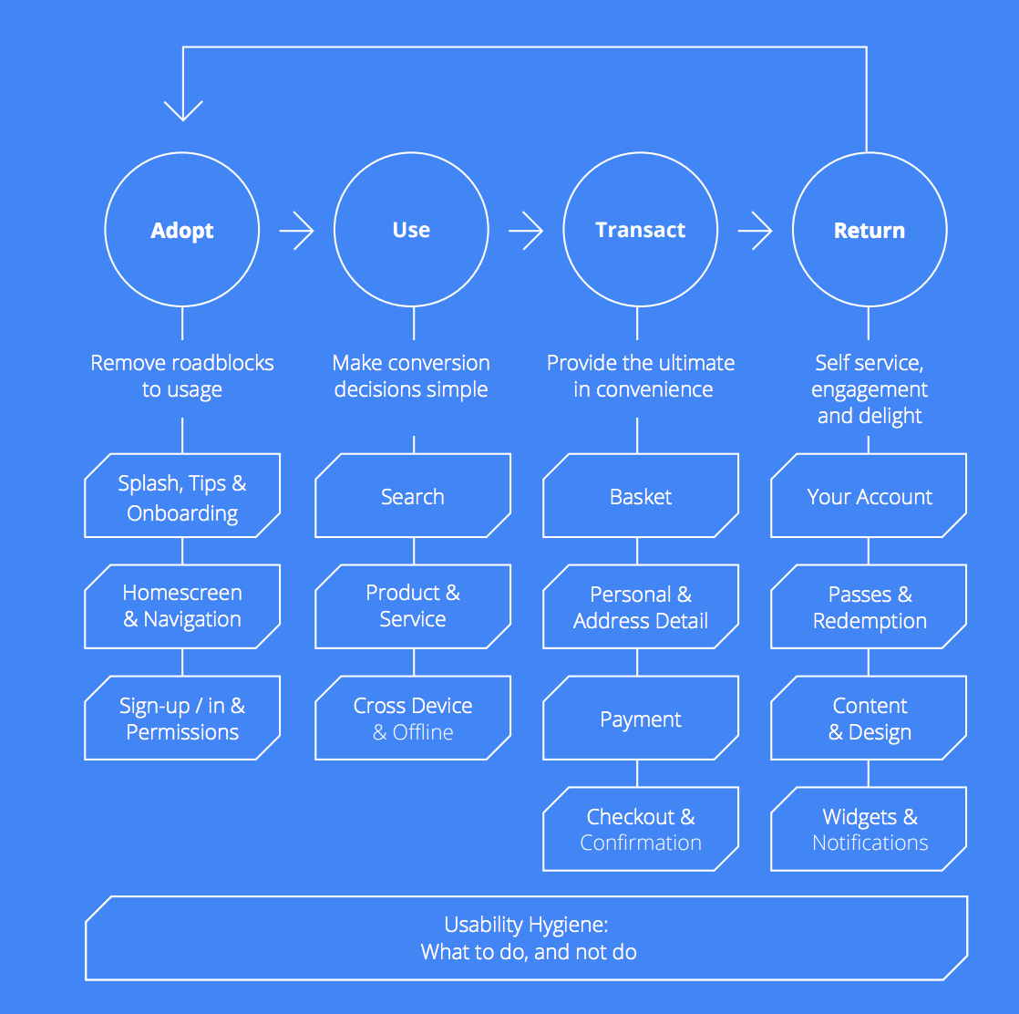 以下是應(yīng)用設(shè)計時的四個步驟:適應(yīng)、使用、交易、回流