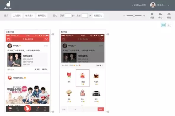 最后,聽(tīng)說(shuō)很多試用過(guò)的朋友都在詢(xún)問(wèn),如何在Demoo中模擬浮層的效果,Demoo其實(shí)更擅長(zhǎng)的是頁(yè)面之間的跳轉(zhuǎn),那么如何模擬呢?這里給大家一個(gè)小技巧。