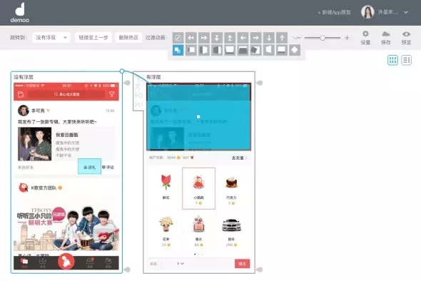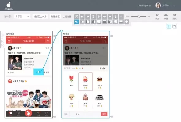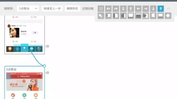 真實(shí)的app中,頁(yè)面間常常通過(guò)方向來(lái)示意層級(jí)關(guān)系,例如重新創(chuàng)建的流程,通常創(chuàng)建頁(yè)面會(huì)從底部向上呼起,于是,在建立熱區(qū)鏈接過(guò)程時(shí),我們需要對(duì)鏈接進(jìn)行方向設(shè)定。如圖示,我將點(diǎn)歌臺(tái)呼起的頁(yè)面出現(xiàn)形式,設(shè)定為從下往上出。如果不是很確定切換效果,Demoo很細(xì)心的在這里設(shè)計(jì)了動(dòng)畫(huà)預(yù)覽,鼠標(biāo)停留在小方塊上時(shí),會(huì)有微動(dòng)畫(huà)示意,多看幾遍也就明白了。